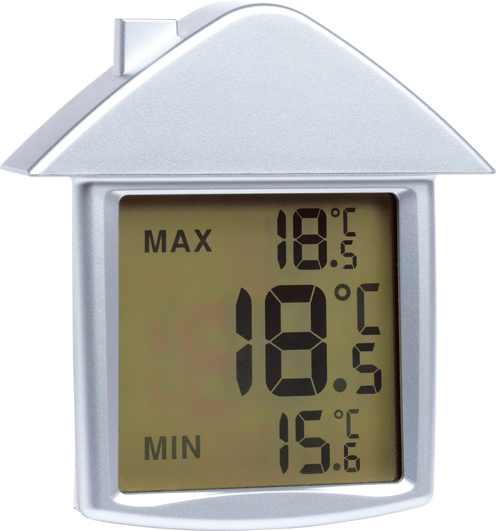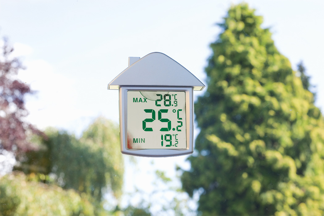 Thermometer COMFORT: mit Temperaturanzeige des gemessenen Minimal- und Maximalwertes, Messbereich 0-50°C, mit Saugnapf und abnehmbarem Hausdach für eine variable Anbringung