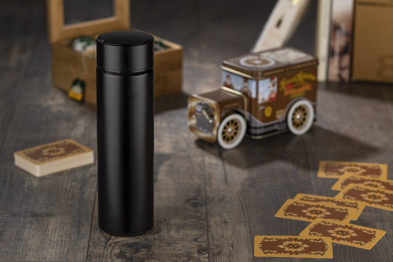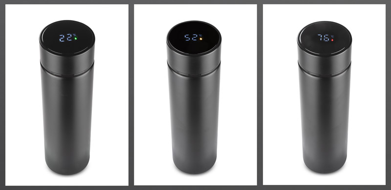 Die Thermoflasche THERMO ist ein sehr interessantes Gadget. Es kombiniert die klassische Funktion einer Thermoskanne und Elektronik in Form eines in die Kappe eingebauten Digitalthermometer. Drehen Sie die Flasche einfach 10 Sekunden lang um, um die Temperatur des Getränks abzulesen. Zusätzlich wird ein Tropfensymbol angezeigt, dessen Farbe sich je nach Temperatur ändert: rot, wenn das Getränk heiß ist, gelb, wenn es trinkbar ist, und grün, wenn es kalt ist. Dank des Vakuums zwischen den Wänden hält es die Temperatur etwa 13 Stunden lang. Hergestellt aus Edelstahl 304. Im Inneren befindet sich ein Sieb, dank dem wir Tee brauen können.