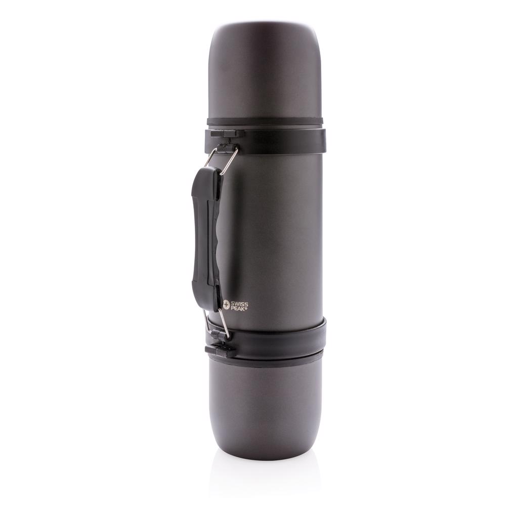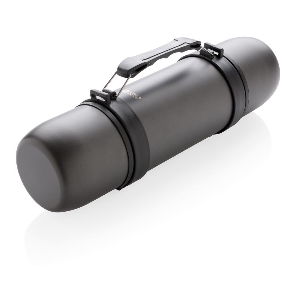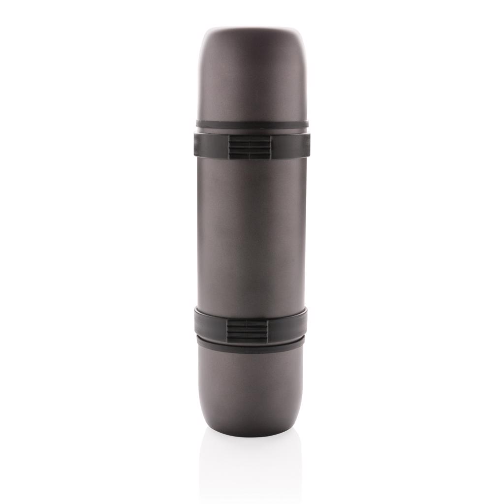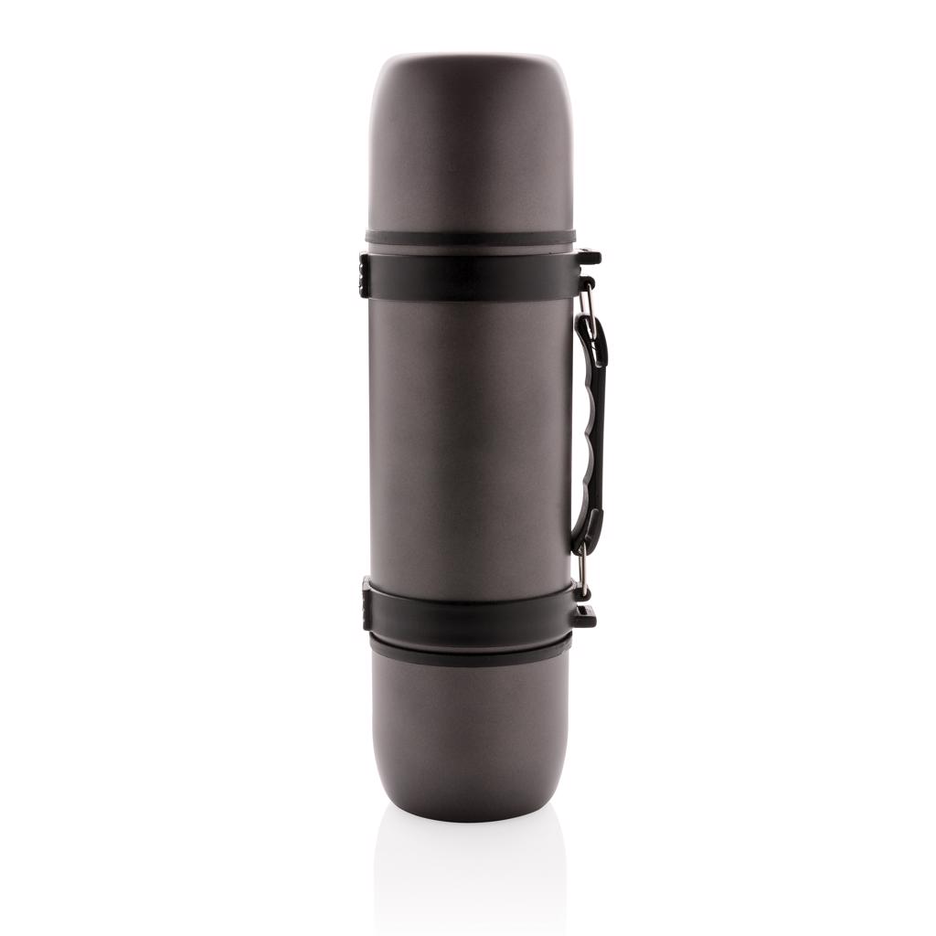Doppelwandige Stainless-Steel Thermosflasche in elegantem Design mit Griff und Schultergurt sowie 2 passenden Tassen. Auslaufsicher, nur Handwäsche. Inhalt: 700ml.