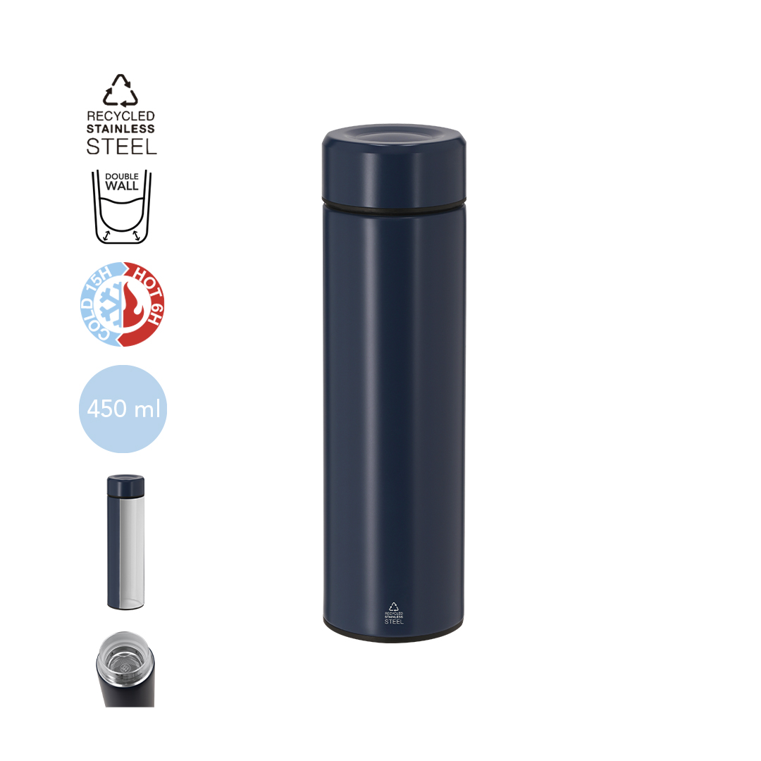 Thermosflasche aus recyceltem Edelstahl mit einem Fassungsvermögen von 450 ml. Mit doppelter Wand für bessere und langlebigere Temperaturkonservierung und Innenbeschichtung aus Keramik, geeignet für kohlensäurehaltige Getränke. Infuser inklusive und einfach zu öffnendes Schraubsystem. Mit Kennzeichnung für recycelten Edelstahl. Edelstahl ist eines der gefragtesten Materialien und kann fast überall gefunden werden, von Alltagsprodukten bis hin zu großen Konstruktionen. Mit unzähligen Eigenschaften, darunter Haltbarkeit und hohe Wiederverwendbarkeit, ist es eine sehr geschätzte Alternative in Nachhaltigkeitslösungen. Richtig verarbeitet, ermöglicht es die Gewinnung neuer Ressourcen von unendlicher Nutzung.
