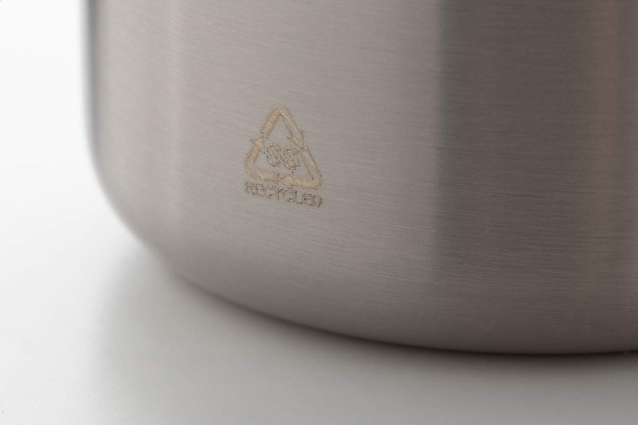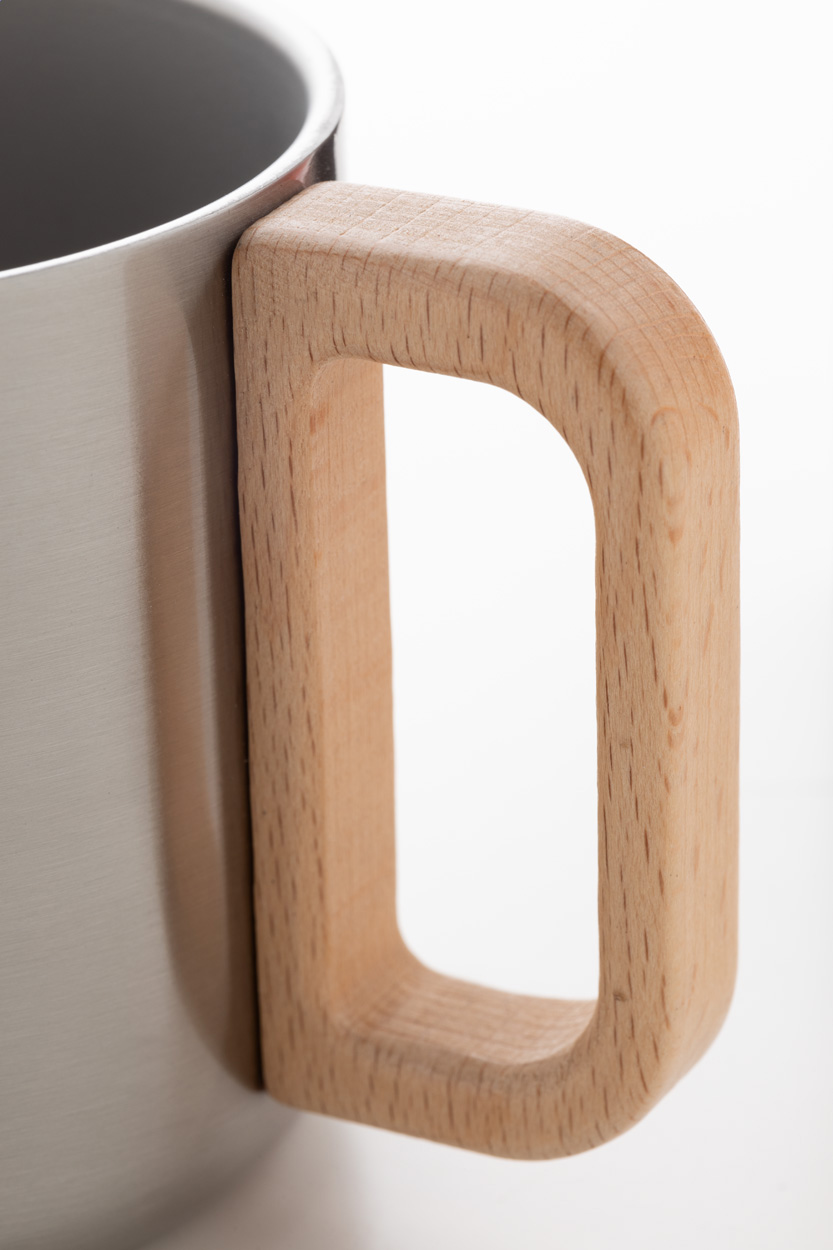 Doppelwandiger Thermobecher aus recyceltem Edelstahl mit Holzgriff. Füllmenge: 350 ml.