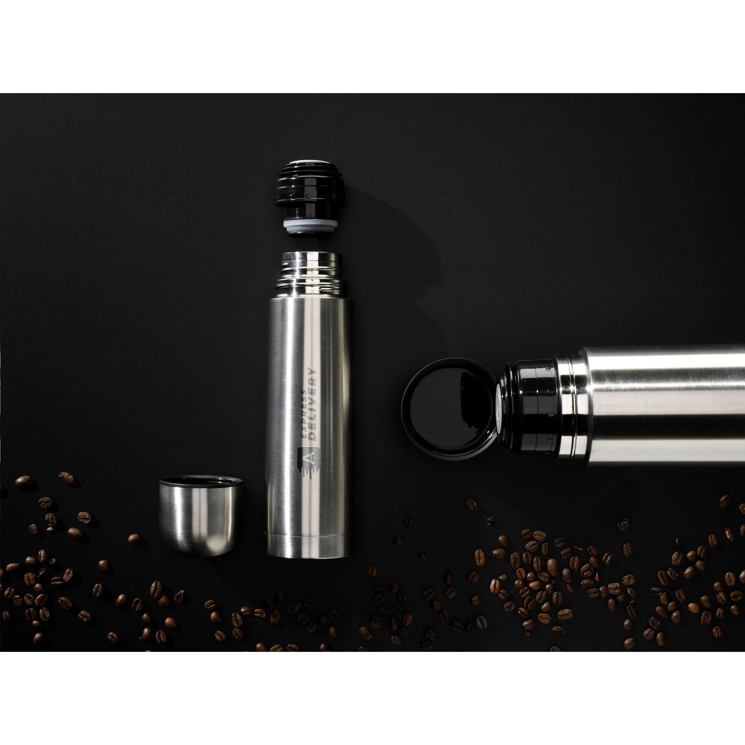 Doppelwandige, vakuumisolierte, rostfreie Thermoflasche aus recyceltem Edelstahl. Unzerbrechlich und unverwüstlich. Der Vakuumraum zwischen den Wänden isoliert den Inhalt und hält Getränke lange Zeit warm oder kalt. Mit Schraubdeckel/Trinkbecher und handlichem Schanksystem mit Druckverschluss. Tropfsicher. Nicht spülmaschinengeeignet. RCS-zertifiziert. Gesamtes recyceltes Material: 69%. Fassungsvermögen 500 ml. Edelstahl kann viele Male recycelt werden – die Qualität des Materials bleibt dabei weitgehend erhalten. Durch die Verwendung von recyceltem Edelstahl kommt eine geringere Menge an neuen Rohstoffen zum Einsatz. Das bedeutet weniger Energieverbrauch und weniger Wasserverbrauch.