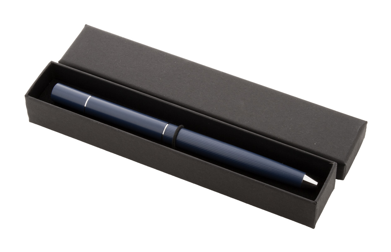 2in1 Drehkugelschreiber (blauschreibend) und tintenloser Stift aus Metall, verpackt in einer schwarzen Geschenkbox. Der tintenlose Stift hat eine Mine aus einer Metalllegierung, die das Papier zum oxidieren bringt.