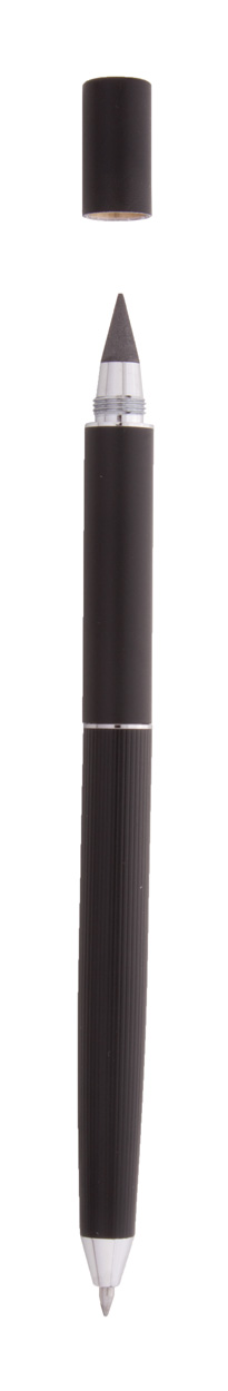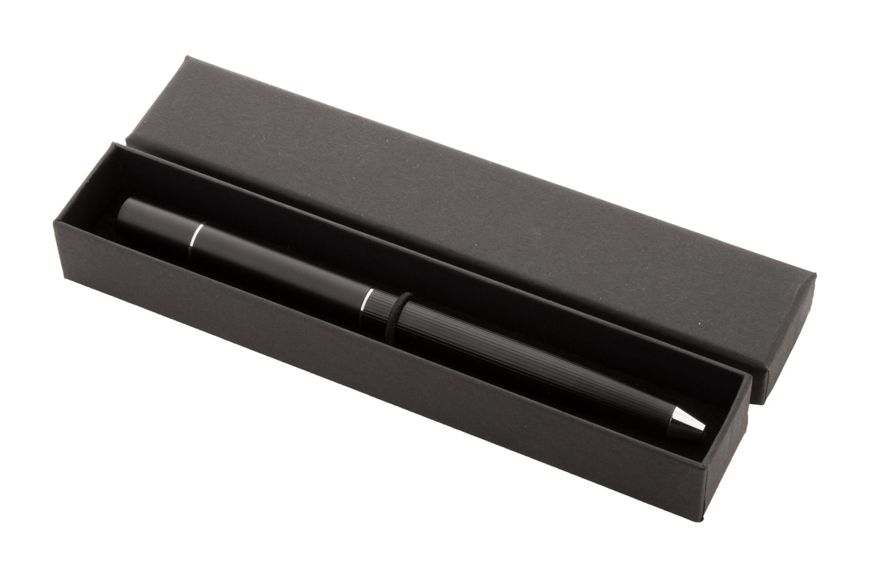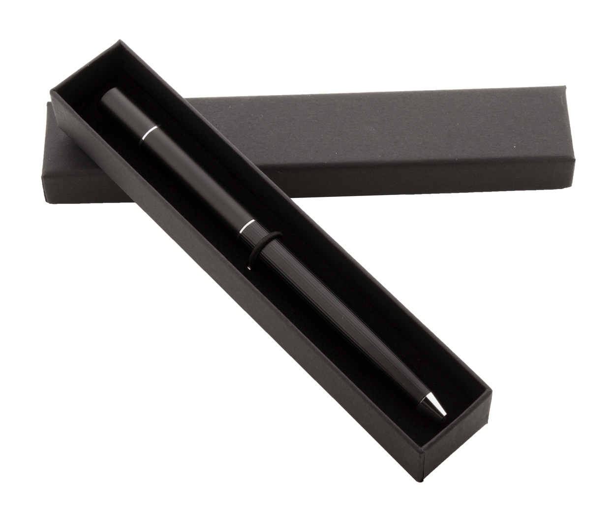 2in1 Drehkugelschreiber (blauschreibend) und tintenloser Stift aus Metall, verpackt in einer schwarzen Geschenkbox. Der tintenlose Stift hat eine Mine aus einer Metalllegierung, die das Papier zum oxidieren bringt.