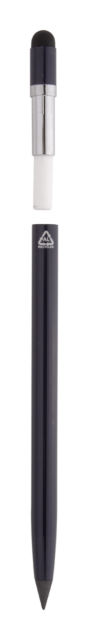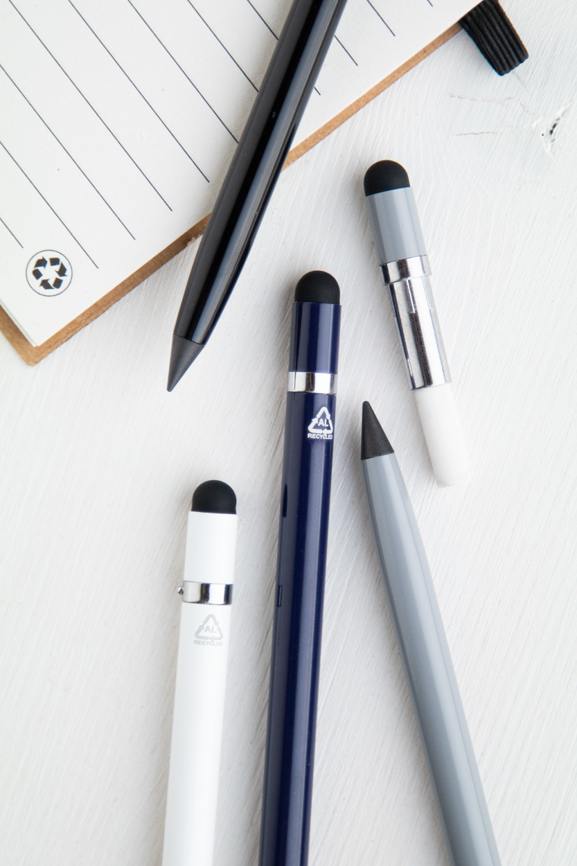 Langlebiger, tintenloser Stift aus recyceltem Aluminium mit Touchpen und Spitze aus einer Metalllegierung, welcher das Papier oxidieren lässt. Dieser Stift schreibt ähnlich wie ein Bleistift und kann ebenfalls wegradiert werden. Inkl. Radierer auf der Innenseite des Touch-Stylus.