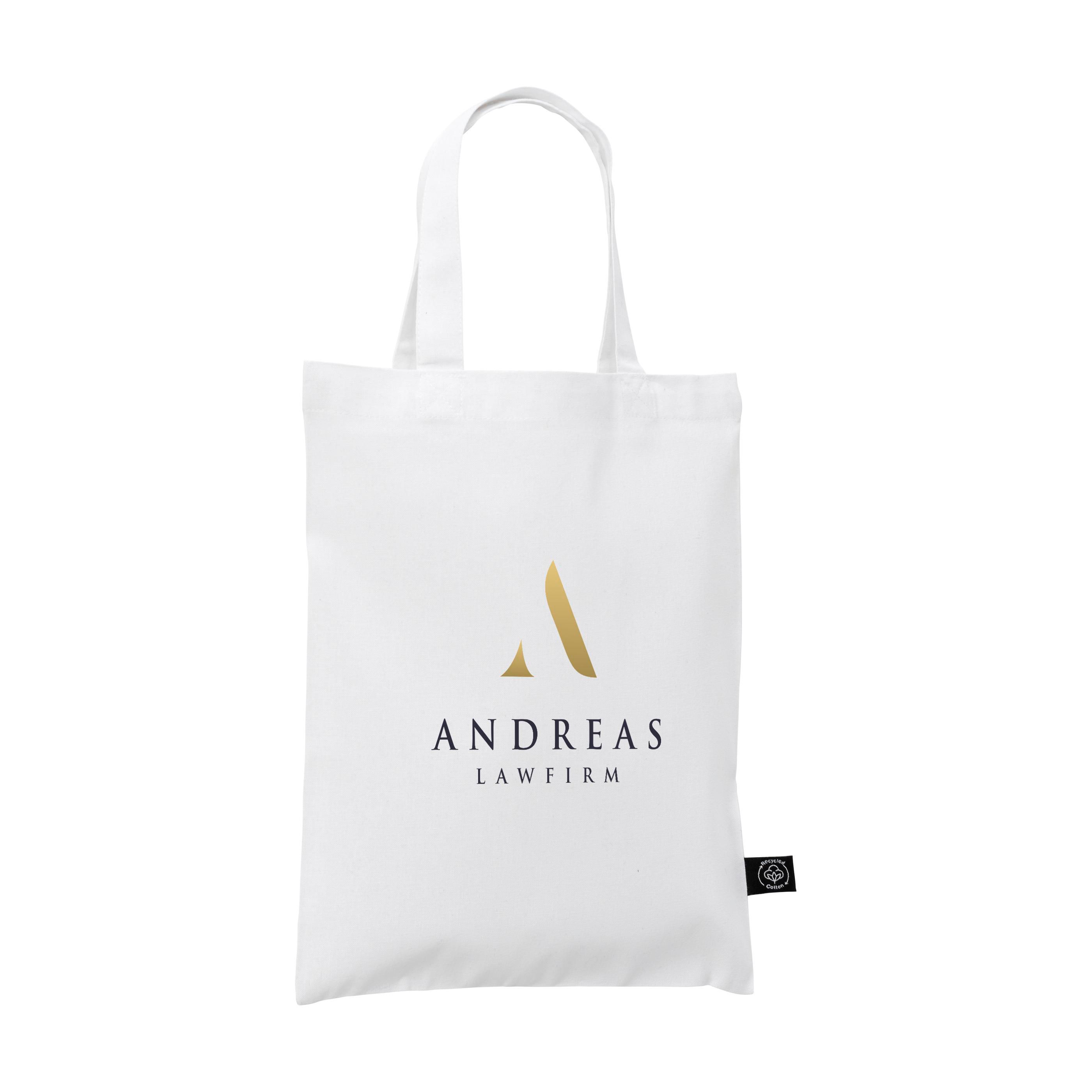Kompakte Baumwolltasche mit kurzen Tragegriffen, hergestellt aus 60% recycelter Baumwolle und 40% recyceltem Polyester (140 g / m²). Diese vielseitige Tasche eignet sich ideal als Goodie-Bag oder Geschenktüte, ist aber auch praktisch für kleine Einkäufe oder für Kinder, um ihre Sachen darin zu mit zu nehmen. Wiederverwendbar.