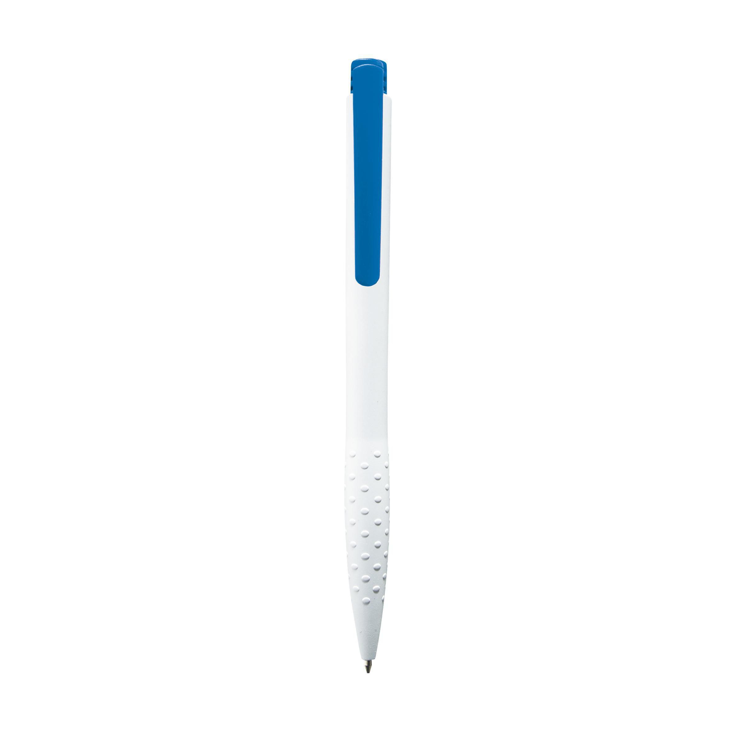 Beschreibung: Blauschreibender oder schwarzschreibender Kugelschreiber mit grifffestem Vorderteil, farbigem Clip und Druckknopf.