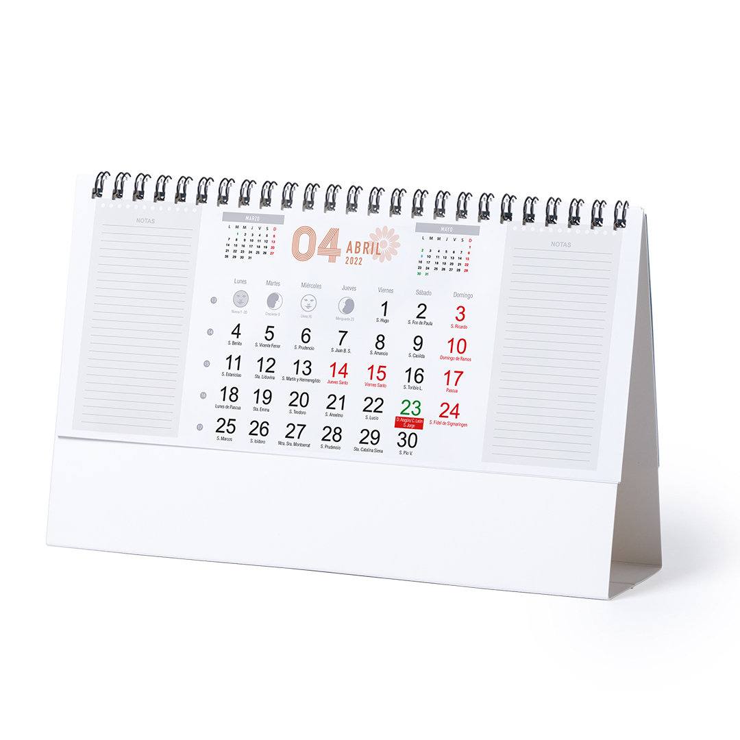 Ring-Tischkalender mit dreieckigem Körper aus Karton. Design laufender Monat / Vorheriger Monat / Nächster Monat, Kalendarium der heiligen Tage und Seiten für Notizen. Große Brandingfläche an beiden Seiten.
