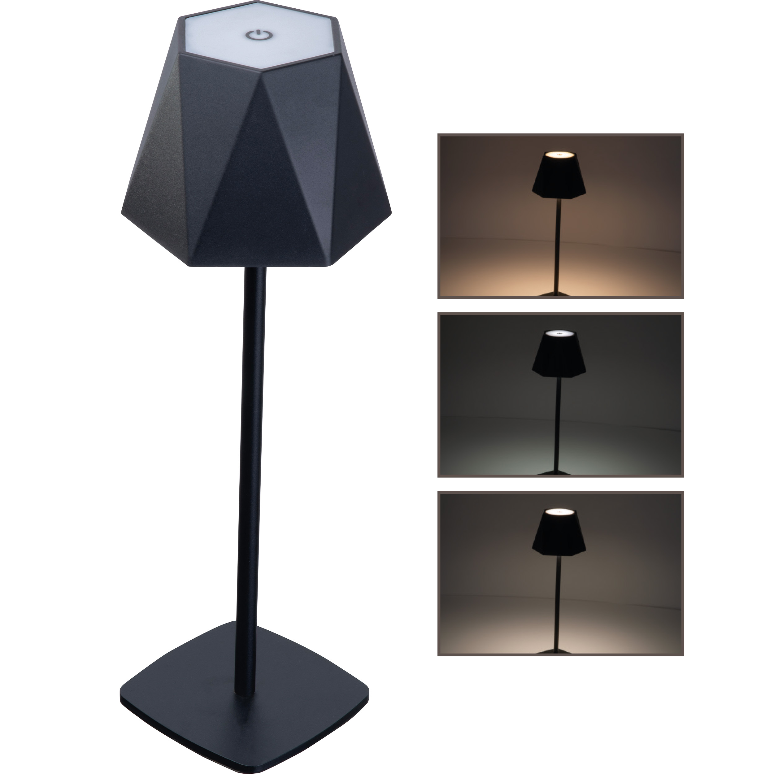 Tischlampe mit Edelstahlfuß und Kunststoffschirm (PP). Die Lampe verfügt über einen 1.800 mAh Li-Ionen-Akku (3,7V), 28 LEDs (130 Lumen, 2,5W) die über den Touchsensor (mit stufenloser Dimmfunktion) zwischen 3000K (warmes Licht) und 6000K (kaltes Licht) wechseln. Ein ein Meter langes USB-C Ladekabel ist im Lieferumfang bereits enthalten. Brenndauer ca. 5 Std. bei vollständiger Ladung. Ihre Werbung bringen wir mittels einer Lasergravur am Fuß an. Die Lampe wird unmontiert geliefert.