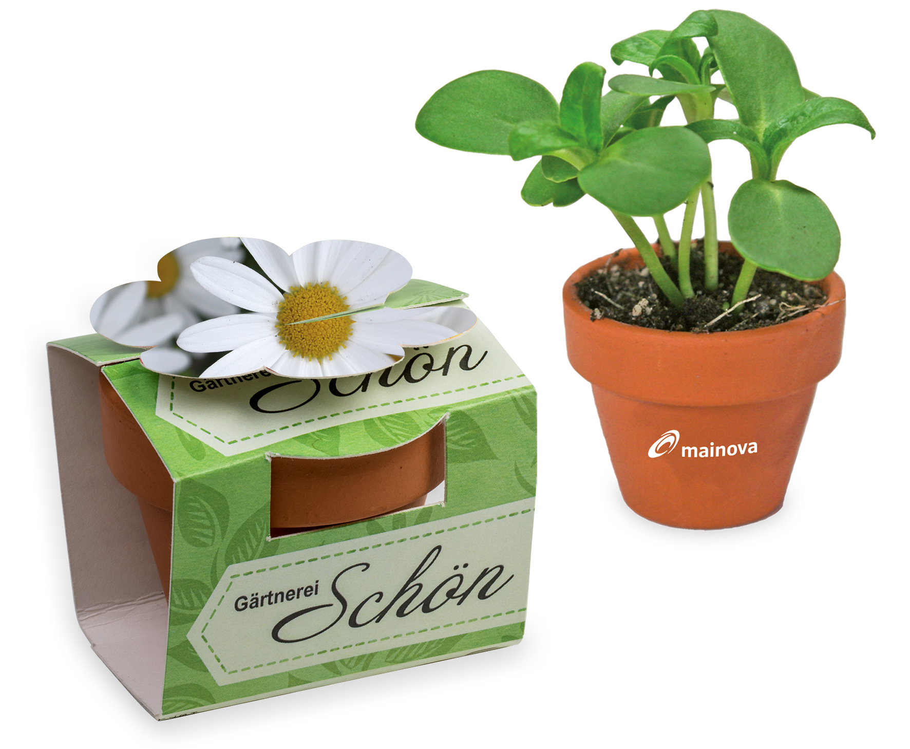 Beschreibung: Das Tontöpfchen aus Terracotta wird mit Samen sowie einer Substrattablette als Erde geliefert. Die Banderole mit Steckverschluss in Form einer Blume macht das Produkt einzigartig und sympathisch. Die Werbebotschaft erfolgt durch die im Digitaldruck individuell bedruckte Banderole und optional durch einen einfarbigen Tampondruck auf dem Töpfchen.