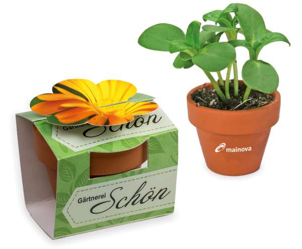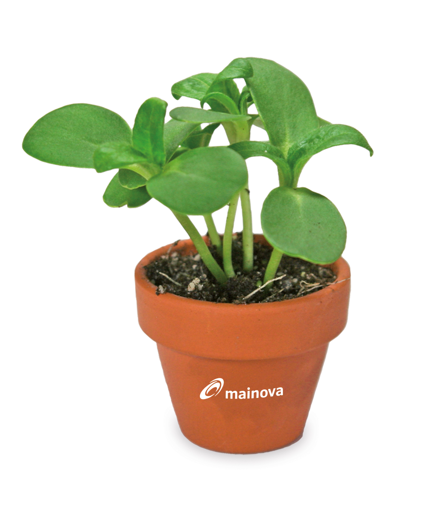 Beschreibung: Das Tontöpfchen aus Terracotta wird mit Samen sowie einer Substrattablette als Erde geliefert. Die Banderole mit Steckverschluss in Form einer Blume macht das Produkt einzigartig und sympathisch. Die Werbebotschaft erfolgt durch die im Digitaldruck individuell bedruckte Banderole und optional durch einen einfarbigen Tampondruck auf dem Töpfchen.