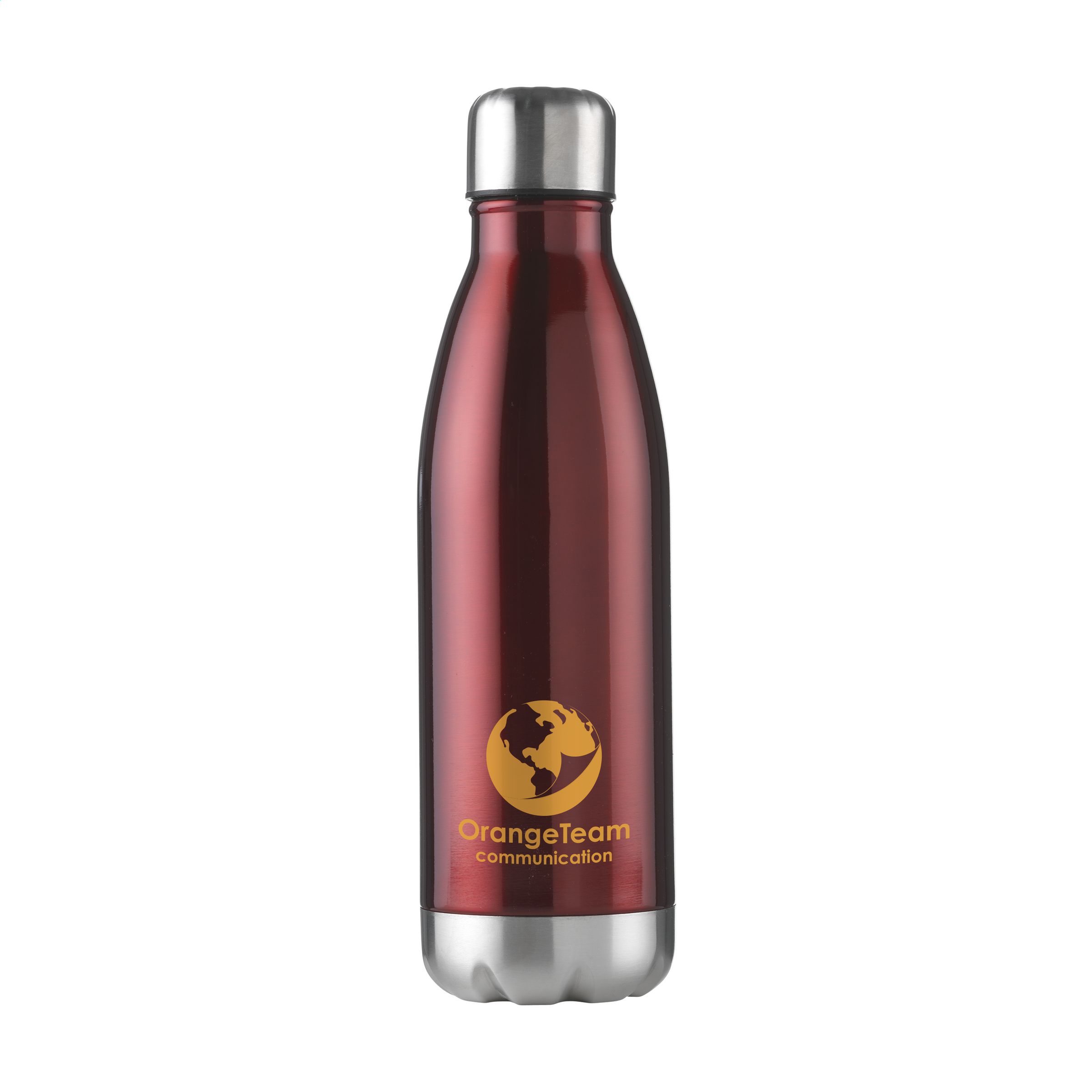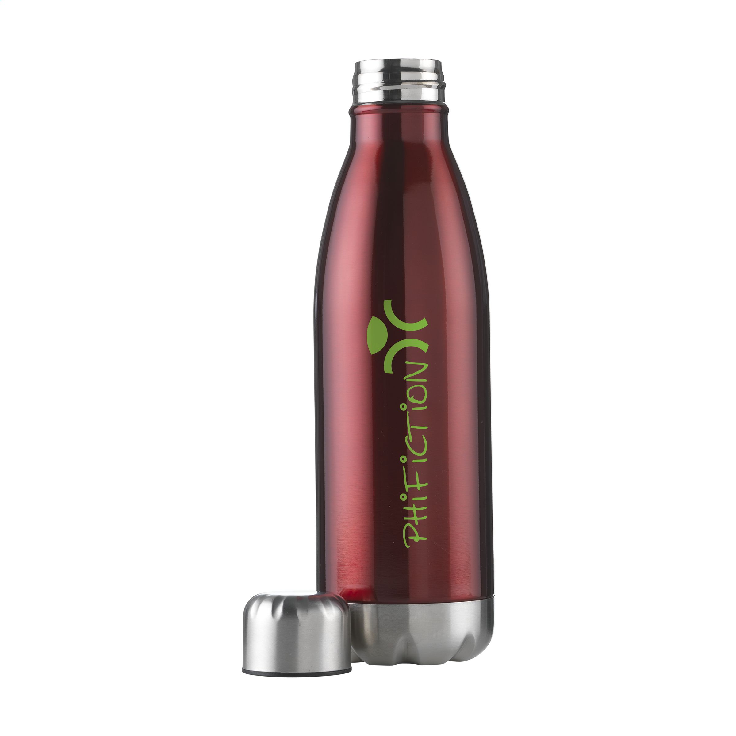 Doppelwandige, vakuumisolierte, rostfreie Wasserflasche / Thermoflasche. Mit tropfsicherem Schraubdeckel. Hergestellt in Metallic oder mit schöner, matter Beschichtung (nur schwarz und weiß). Geeignet zur Temperaturerhaltung von kaltem oder heißem Wasser. Nicht spülmaschinengeeignet. Fassungsvermögen 500 ml. Wird einzeln in einem Kraftkarton geliefert.
