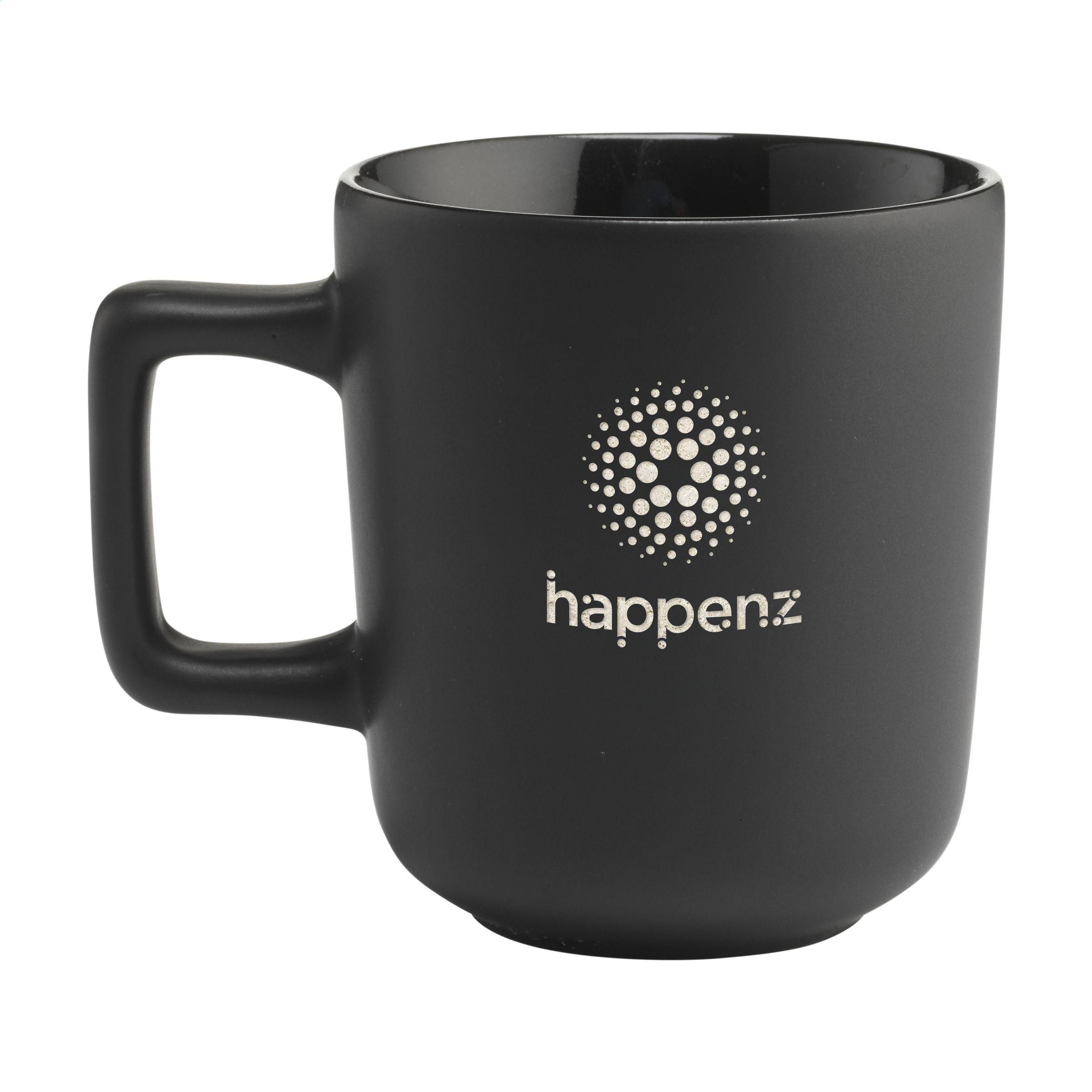 Becher aus hochwertiger Keramik mit einem auffälligen Henkel. Außen matt und innen hochglänzend lackiert. Spülmaschinenfest. Der Druck ist spülmaschinengeprüft und zertifiziert: EN 12875-2. Fassungsvermögen 280 ml. NOTIZ: Der weiße Becher kann nicht mit einer Lasergravur versehen werden, da diese nicht ausreichend sichtbar ist.