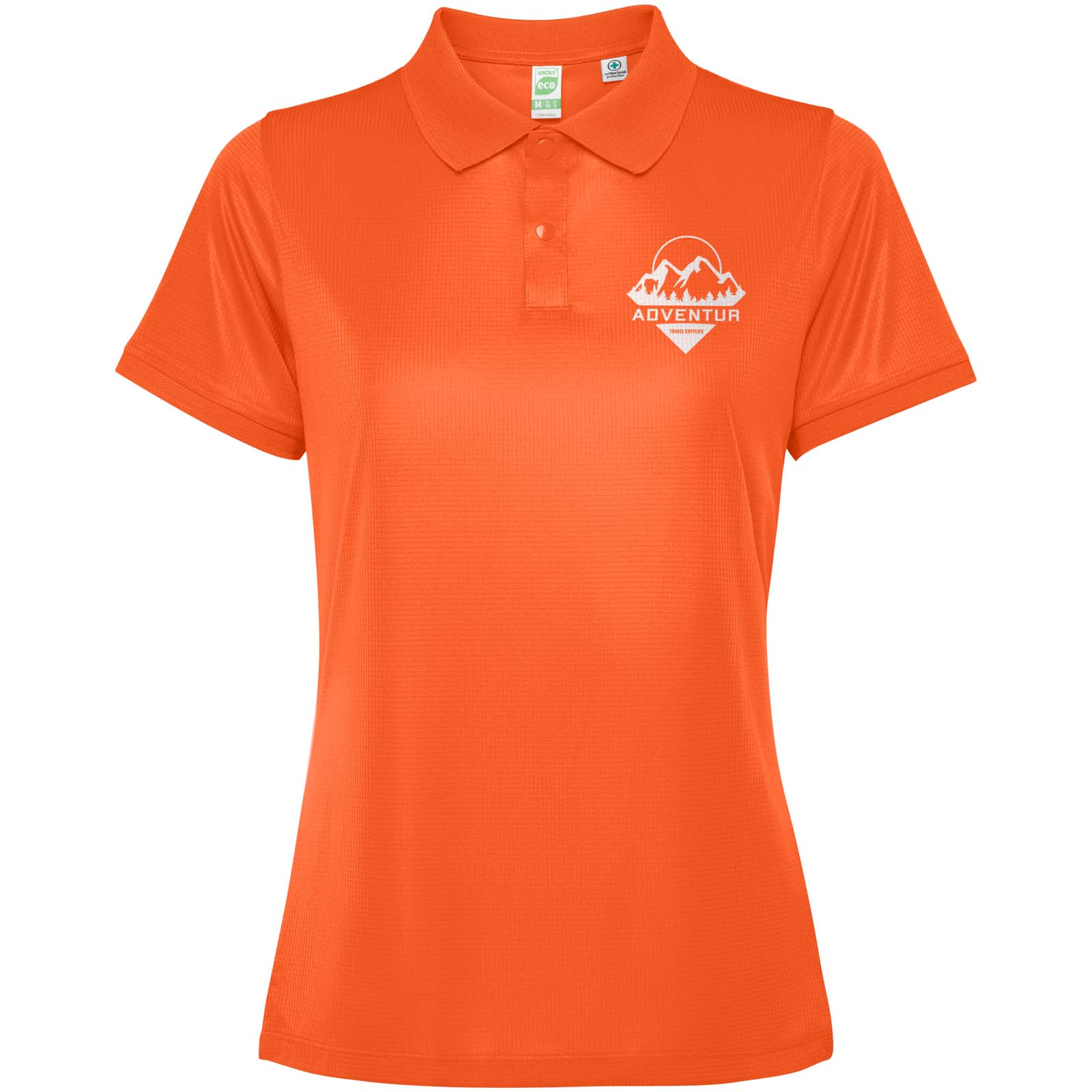 Kurzärmeliges, tailliertes Poloshirt für Damen. Verstärkte und verdeckte Nähte am Innenkragen. 1×1-Rippstrick an Bündchen und Kragen. Seitennähte. Knopfleiste mit 3 Knöpfen und Seitenschlitze.
