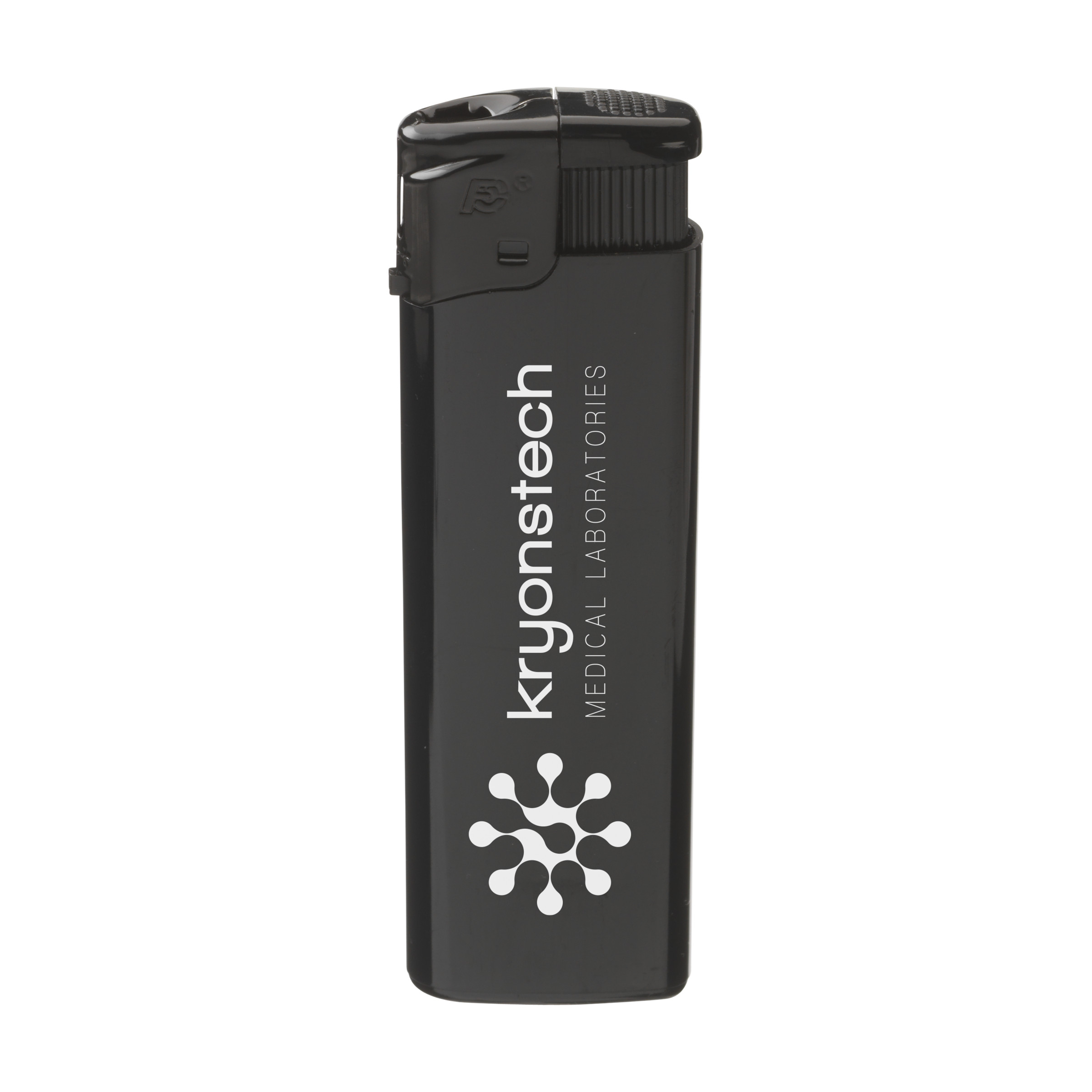 Elektronisches, nachfüllbares Feuerzeug der Marke Flameclub®. Mit Flammenregler. Windsicher- auch bei starkem Wind hält die starke Flamme stand. Mit Kindersicherung. NEN-zertifiziert: EN13869. TÜV-zertifiziert und ISO-zertifiziert: ISO9994. Feuerzeug wird nur mit Aufdruck geliefert.
