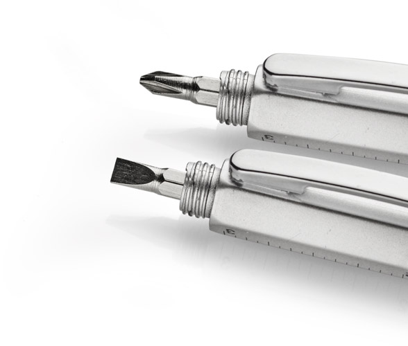 Mehrzweck-Kugelschreiber für jeden Bastler. Das Gadget wurde mit zwei Messgeräten (Zentimeter und Zoll) auf dem Gehäuse und einer kleinen Wasserwage ausgestattet. Unter der Stiftkappe befindet sich einzweiseitiger, mittels von Magnetbefestigung anzubringender Schraubenzieher- leicht zu handhaben und bedienungsfreundlich. Markierung auf dem Gehäuse möglich.