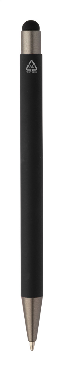 Kugelschreiber mit Touchpen aus recyceltem Aluminium mit Softtouch Oberfläche und Teilen in Gunmetal-Optik. Blauschreibend.