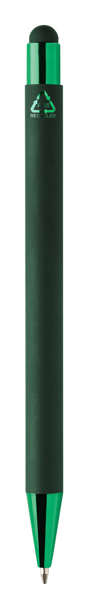 Kugelschreiber mit Touchpen aus recyceltem Aluminium mit Softouch Oberflächeund farbigen, metallisch glänzenden Teilen, mit Spezialbeschichtung für Spiegelavuren passend zu den Metallteilen, blauschreibend.