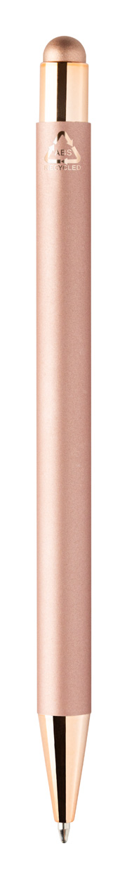Kugelschreiber mit Touchpen aus recyceltem Aluminium mit Softouch Oberflächeund farbigen, metallisch glänzenden Teilen, mit Spezialbeschichtung für Spiegelavuren passend zu den Metallteilen, blauschreibend.