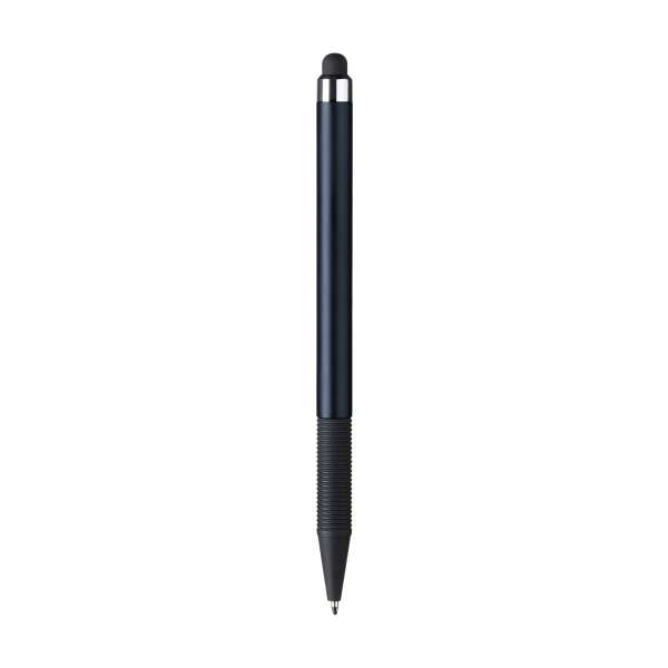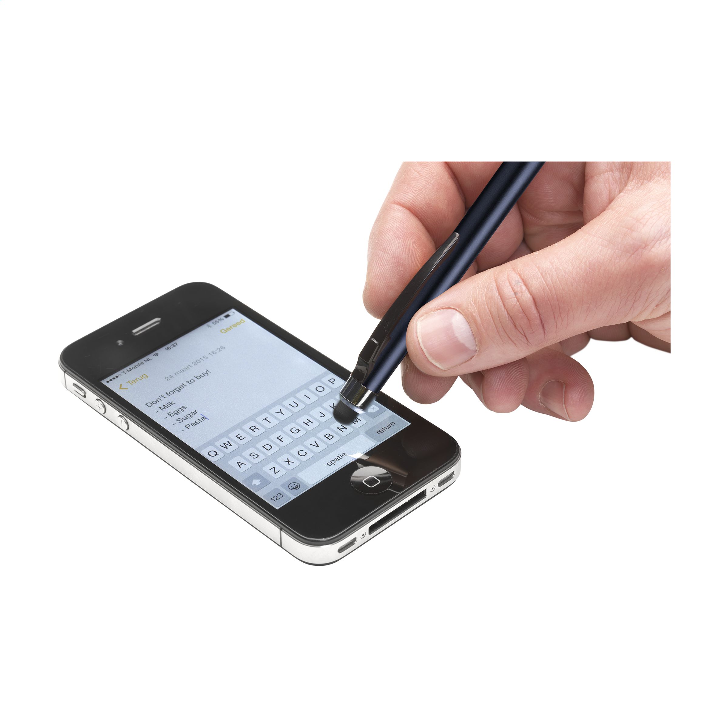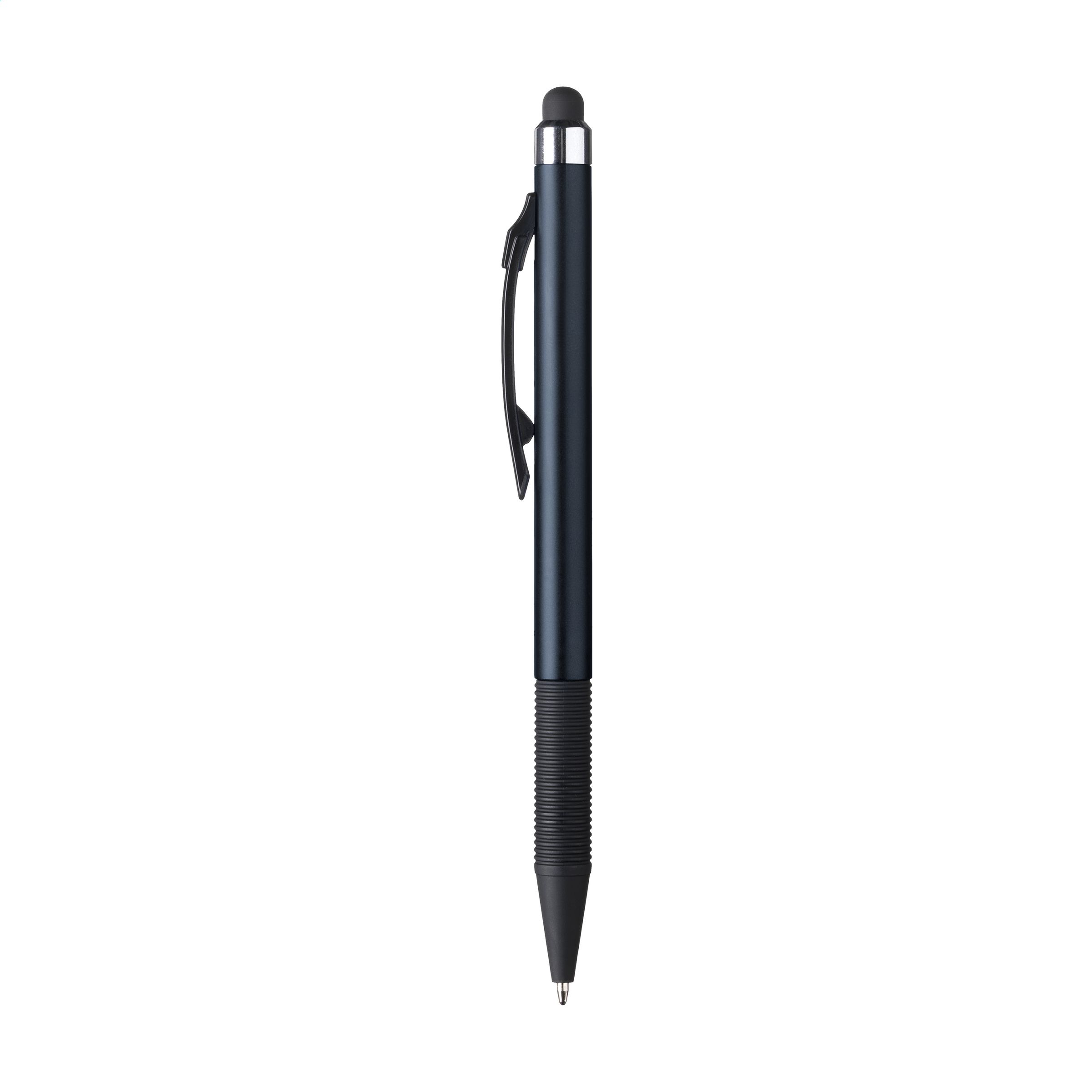 Beschreibung: Blauschreibender, leichter Kugelschreiber mit Oberteil zum Bedienen von Touchscreens (wie iPhone / iPad). Schlankes Gehäuse in Metalloptik mit Clip als Druckknopf und griffigem Gummivorderteil.
