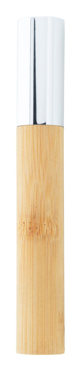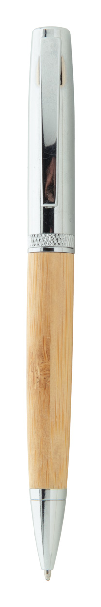 Eleganter Drehkugelschreiber aus Metall mit Bambusschaft und verchromten Elementen. Blauschreibend. Einzeln im Bambus-Etui mit verchromter Kappe.