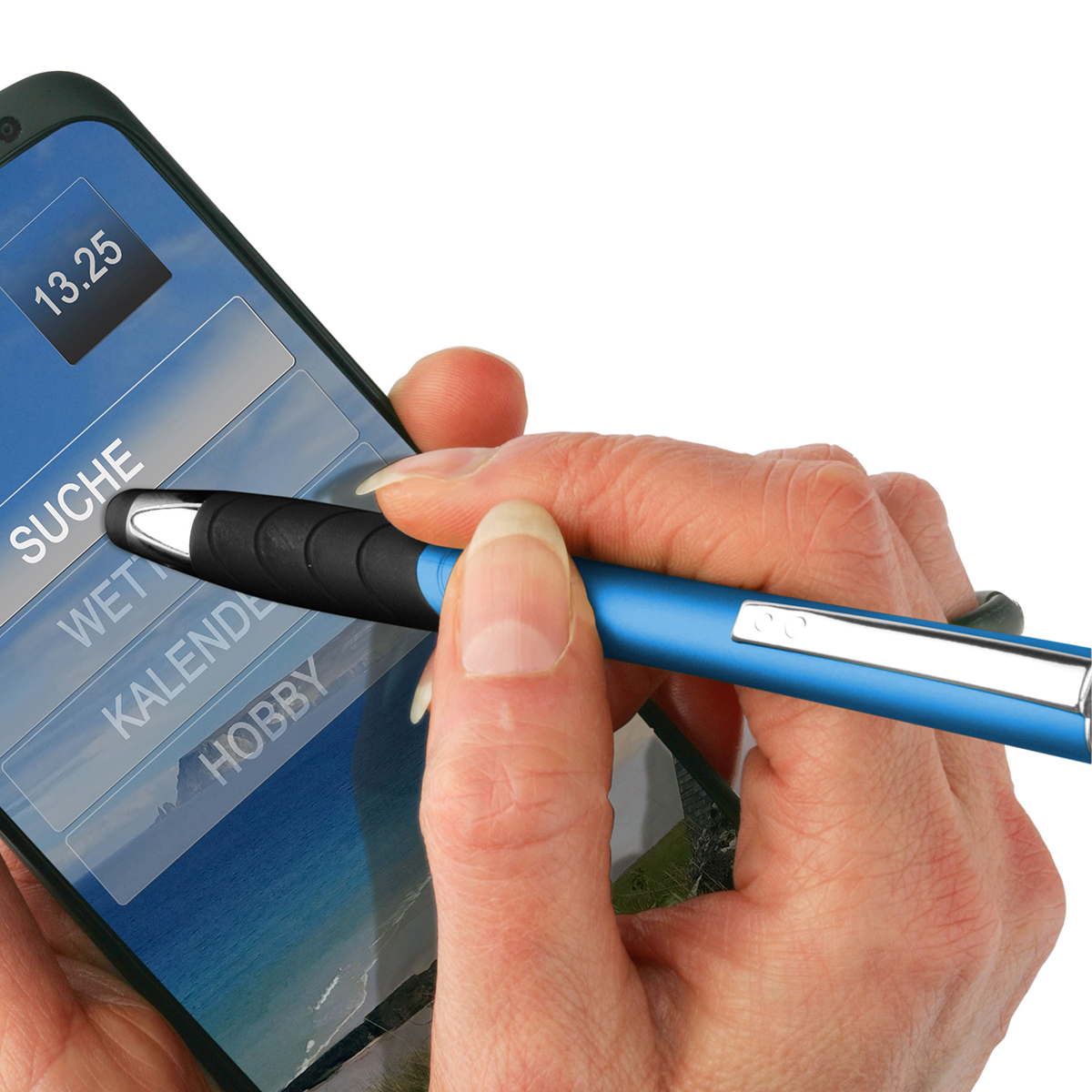 Touchscreen-Druckkugelschreiber"Atlas"EXPRESSDRUCK mit Gummispitze und Softgripzone, Mine X-20, blau schreibend. Versandbereit innerhalb von 5 Arbeitstagen nach Druckfreigabe.