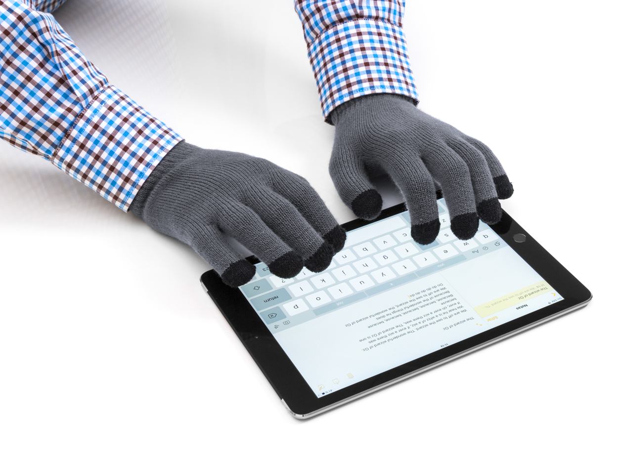 Touchscreen Handschuhe mit spezieller Beschichtung auf 5 Fingern für Touchscreen-Bedienung, in Einheitsgröße für Erwachsene. Material: Acryl.