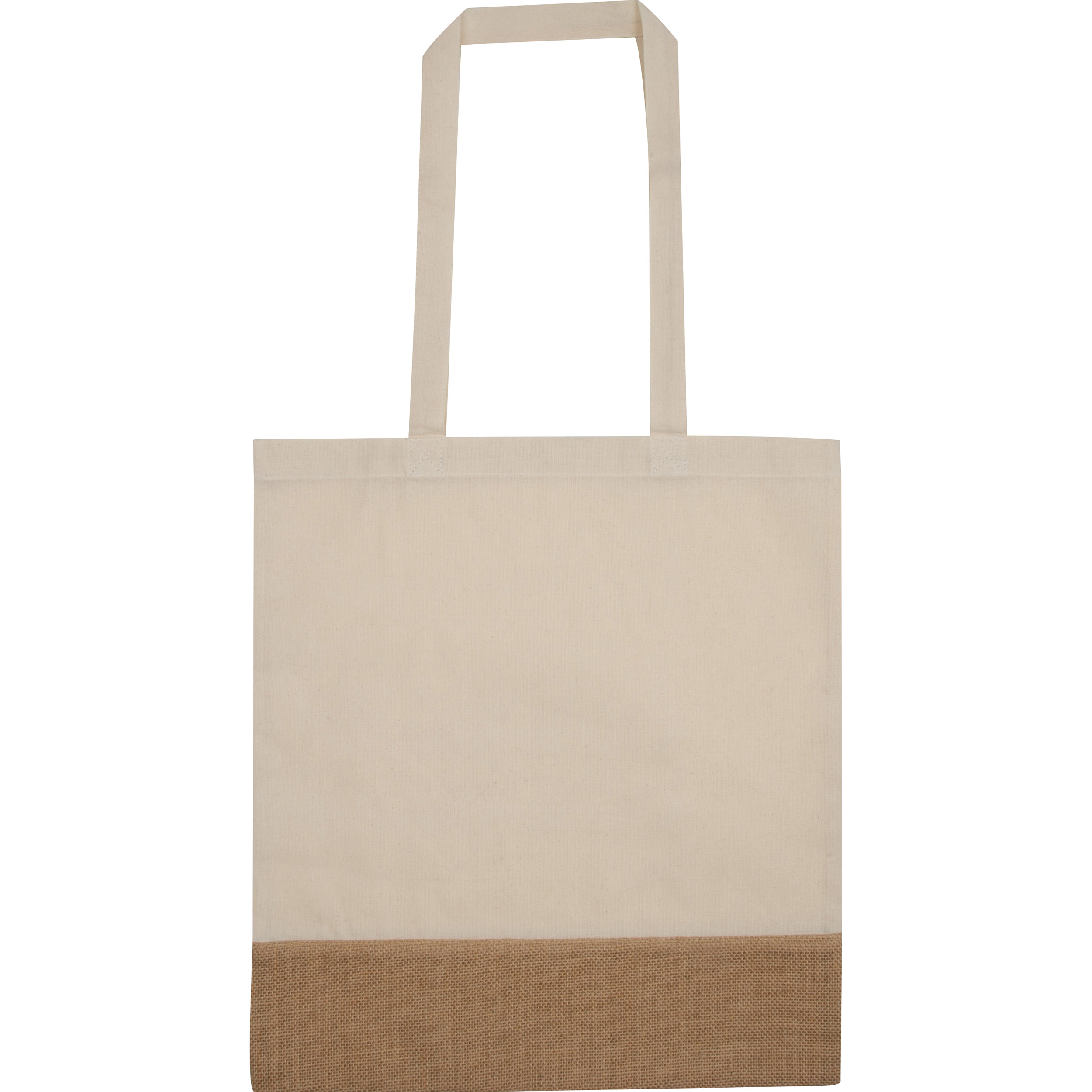 Oeko-Tex® STANDARD 100 zertifizierte Einkaufstasche aus Baumwolle (140g / m²) und Jute. Ihre Werbung wird auf eine Seite gedruckt.
