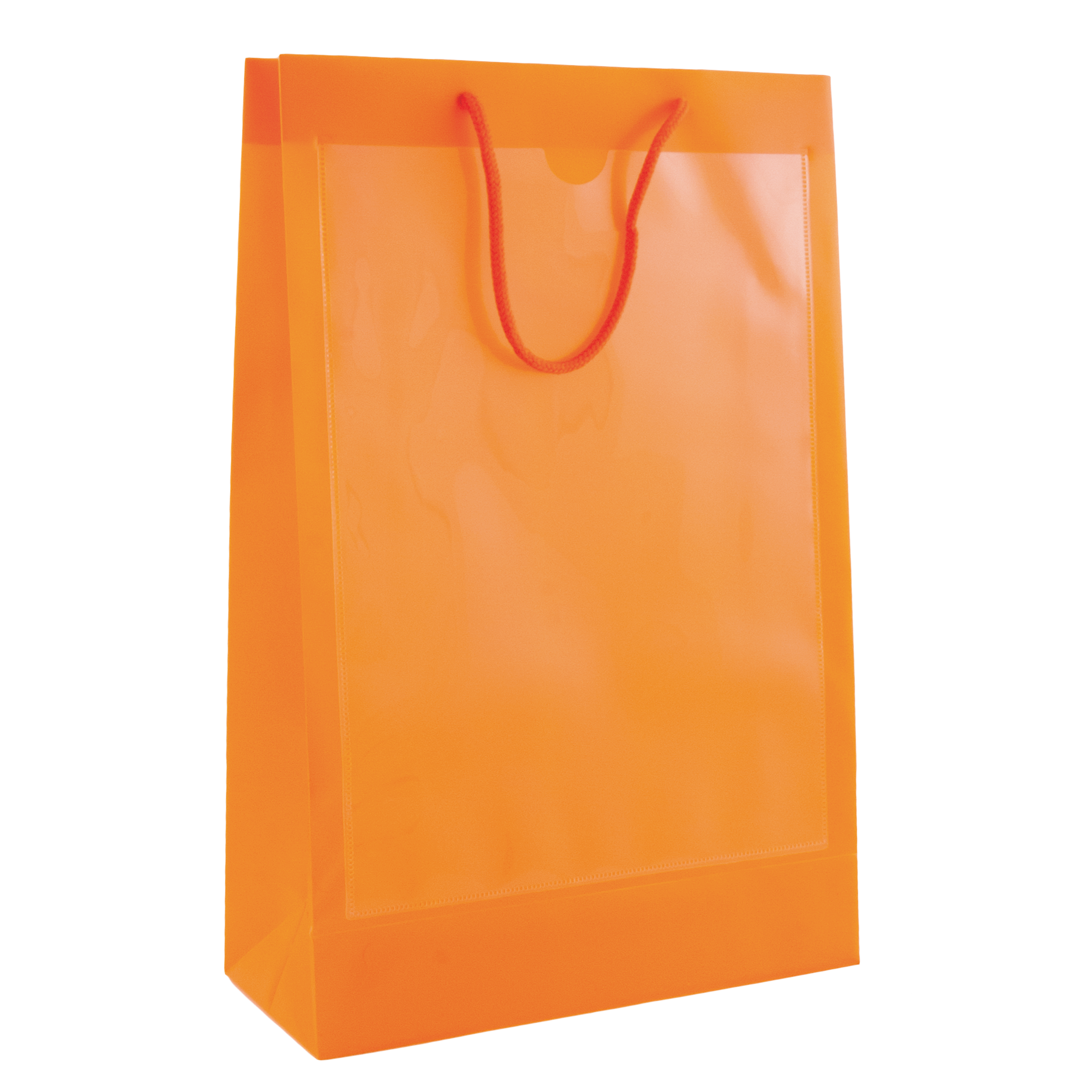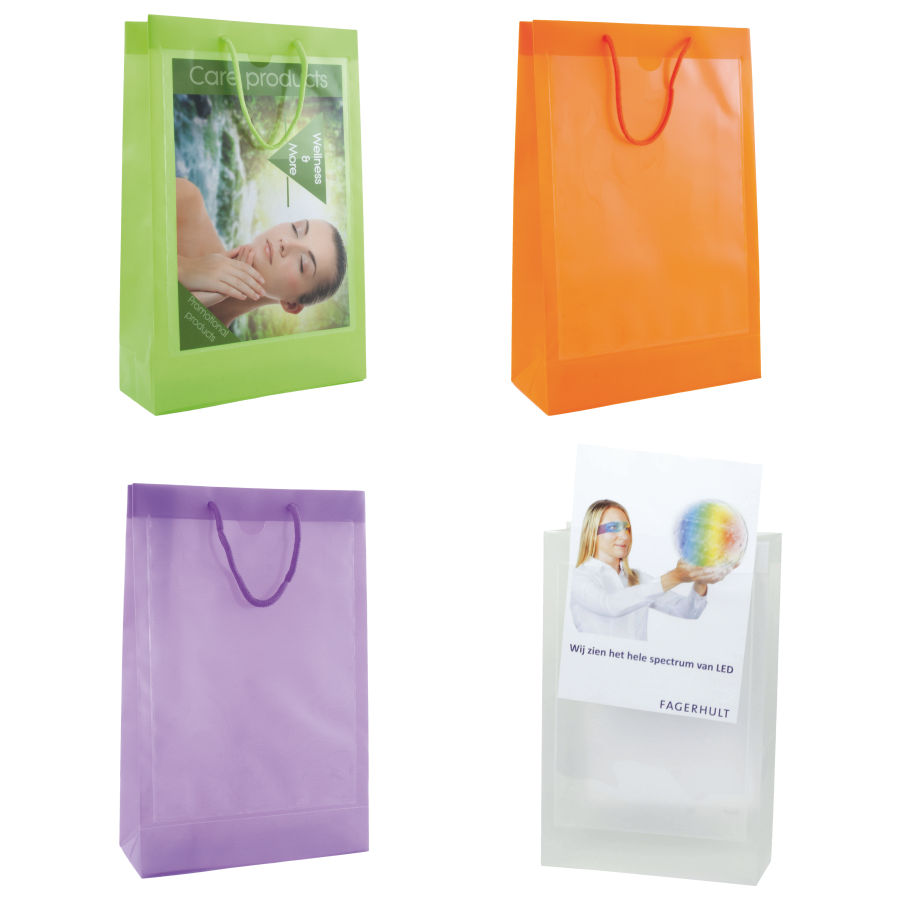 Tragetasche transparent mit 2 Fenstern A4 Inlay, 260 x 400 x 100 mm, mit Kordeln: 5 x 150 mm, Aus recyclebarem Polypropylen.