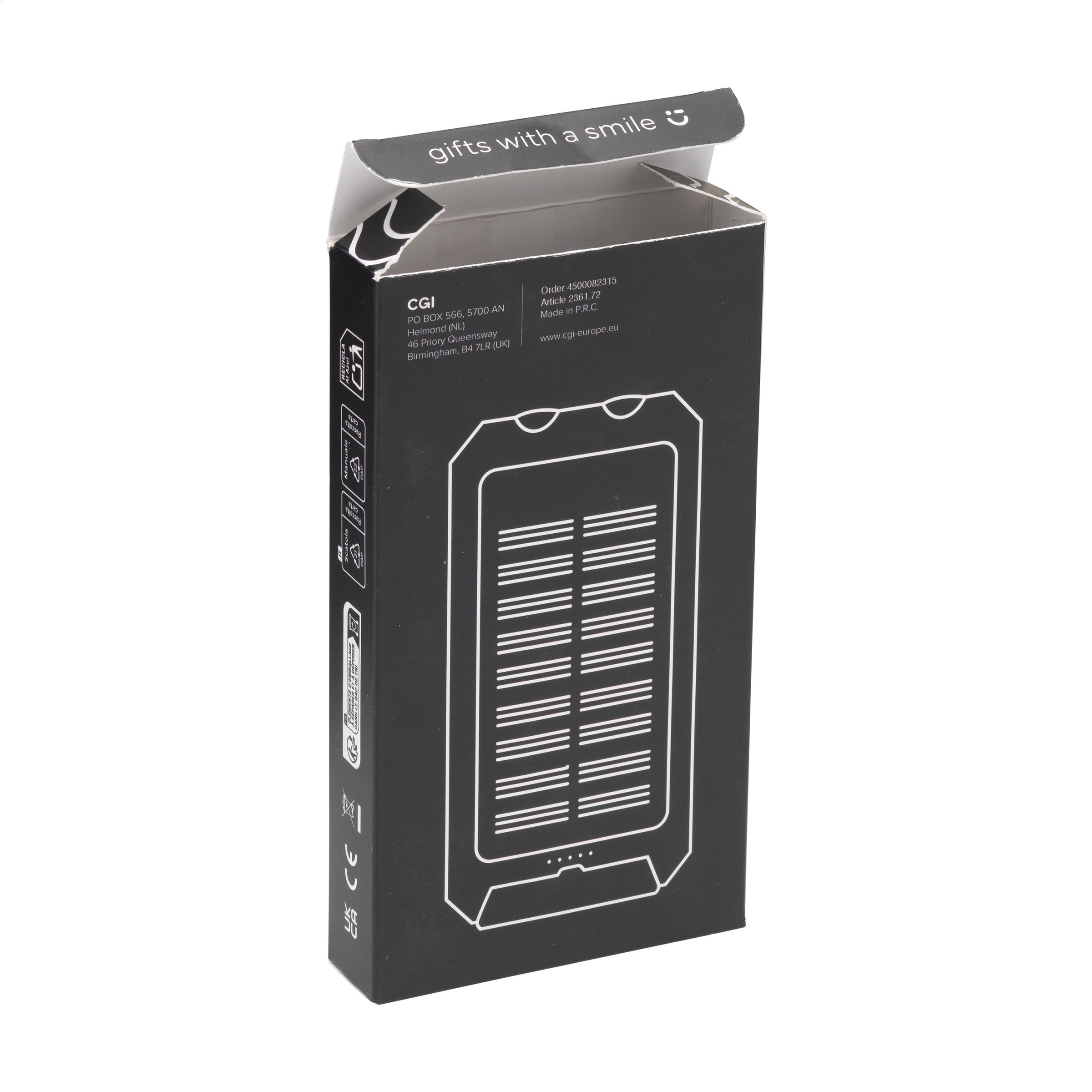 Robuste Outdoor-Solar-Powerbank mit 8.000 mAh und einem Gehäuse aus recyceltem ABS mit schützenden Silikonwülsten an den Ecken. Mit Solarpanel, integriertem Kompass, LED-Anzeigeleuchten, LED-Taschenlampe und Karabiner. Spritzwassergeschützt und staubgeschützt. Geeignet zum Aufladen der meisten gängigen Smartphones und anderer Geräte. Eingang: Typ-C DC5V/2.1A. Ausgang: Typ-C DC5V/2.1A. 1 x USB-A-Anschluss und 2 x USB-C-Anschluss. Eingang Solar: 200 mAh. Solare Ladezeit ca. 40 Stunden. Kann über das Stromnetz oder das Solarpanel geladen werden. Das ideale, vielseitige Ladegerät für Outdoor-Aktivitäten. Inklusive USB-C / USB-C-Ladekabel und Gebrauchsanweisung. RCS-zertifiziert. Gesamtes recyceltes Material: 17%. Pro Stück in einer Verpackung.