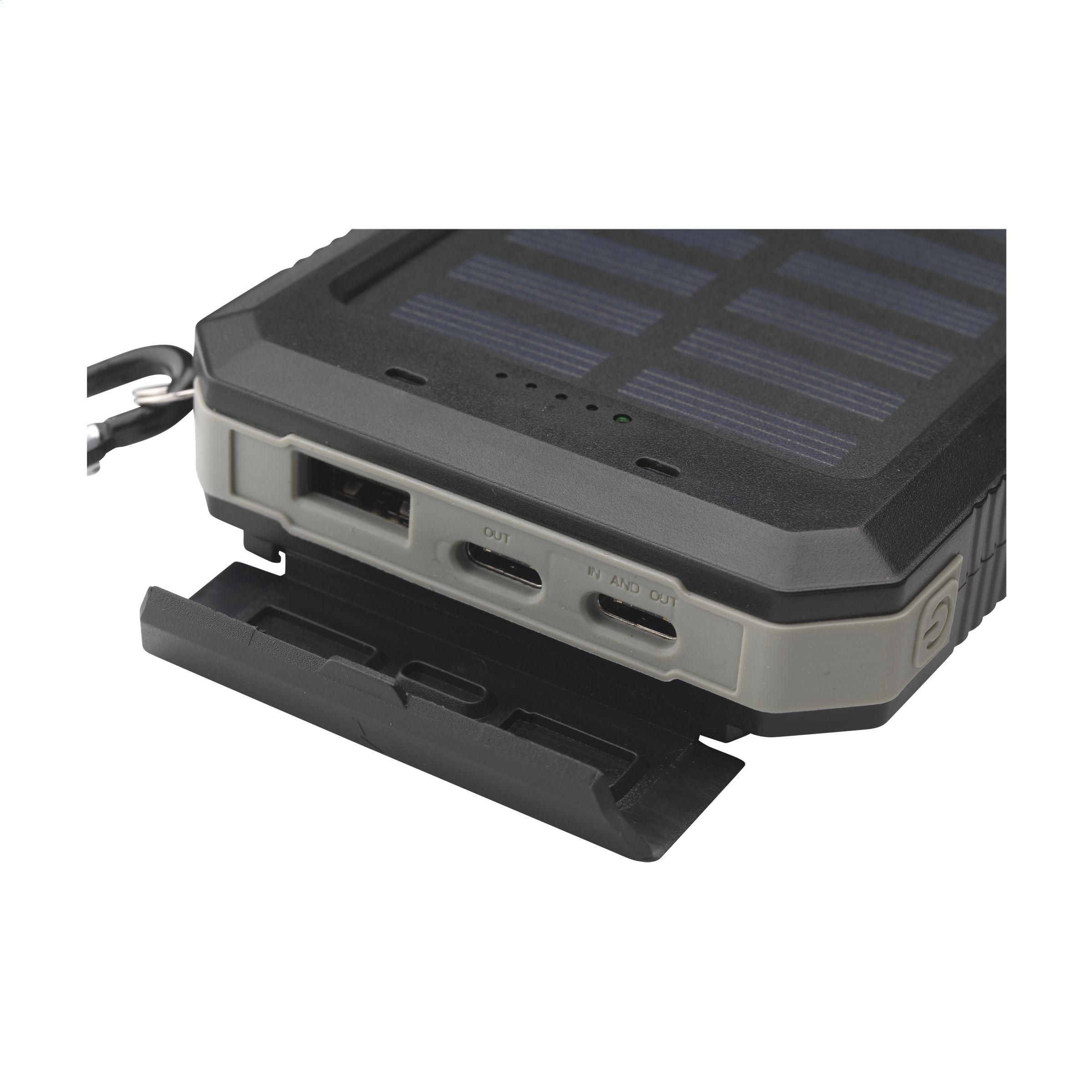 Robuste Outdoor-Solar-Powerbank mit 8.000 mAh und einem Gehäuse aus recyceltem ABS mit schützenden Silikonwülsten an den Ecken. Mit Solarpanel, integriertem Kompass, LED-Anzeigeleuchten, LED-Taschenlampe und Karabiner. Spritzwassergeschützt und staubgeschützt. Geeignet zum Aufladen der meisten gängigen Smartphones und anderer Geräte. Eingang: Typ-C DC5V/2.1A. Ausgang: Typ-C DC5V/2.1A. 1 x USB-A-Anschluss und 2 x USB-C-Anschluss. Eingang Solar: 200 mAh. Solare Ladezeit ca. 40 Stunden. Kann über das Stromnetz oder das Solarpanel geladen werden. Das ideale, vielseitige Ladegerät für Outdoor-Aktivitäten. Inklusive USB-C/USB-C-Ladekabel und Gebrauchsanweisung. RCS-zertifiziert. Gesamtes recyceltes Material: 17%.