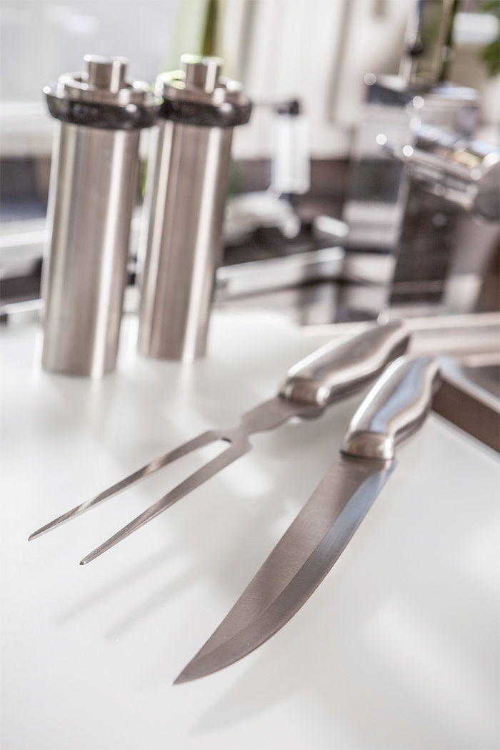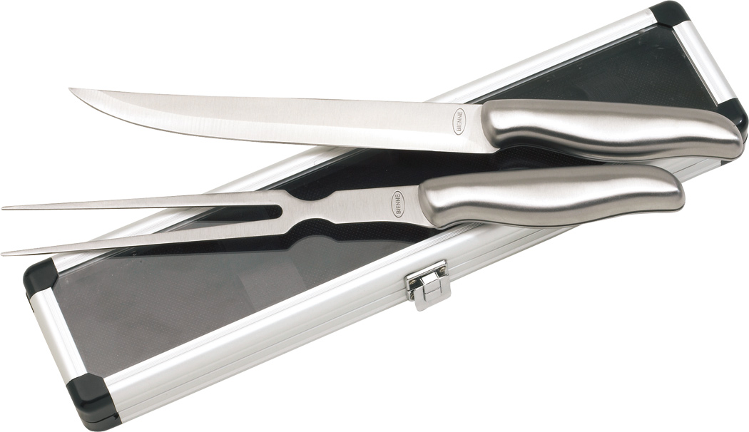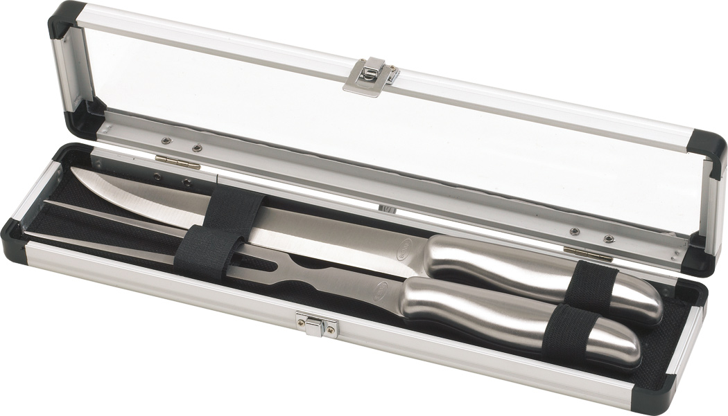 Edelstahl-Tranchierbesteck ROASTBEEF: bestehend aus Fleischmesser und Gabel, im silberfarbigen Koffer mit transparentem Deckel, in Box