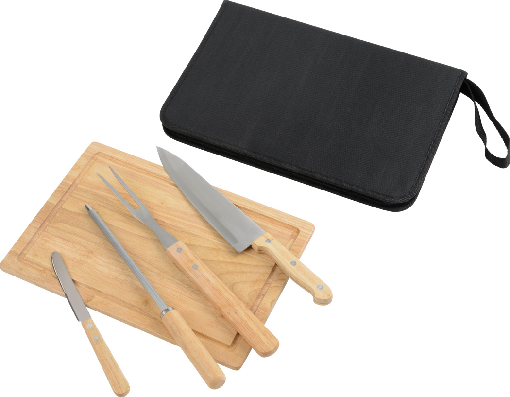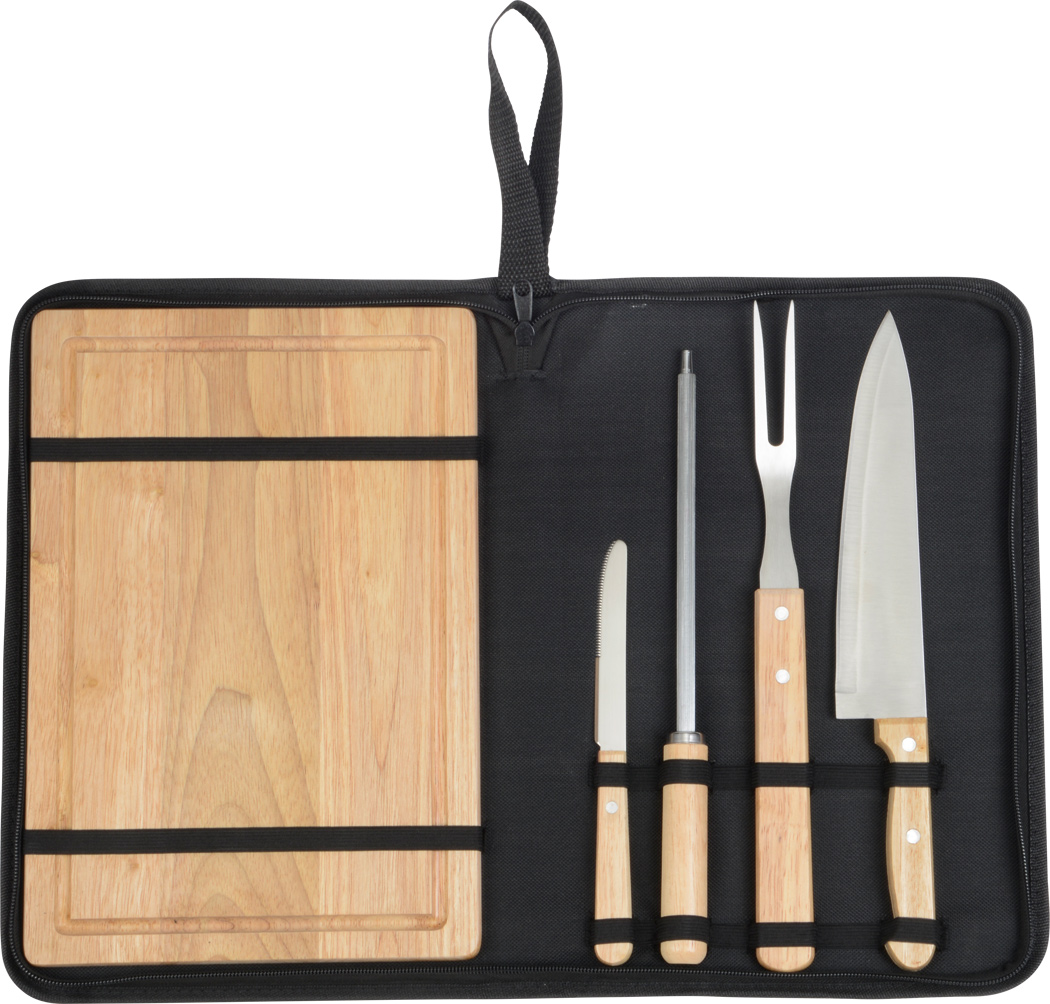 Tranchierset BEST BBQ: 5-teilig: Grillbesteck inkl. Wetzstab, Fleischmesser, Fleischgabel und Steakmesser aus Edelstahl mit Holzgriff, Brett mit praktischer Ablaufrille am Rand, in Box