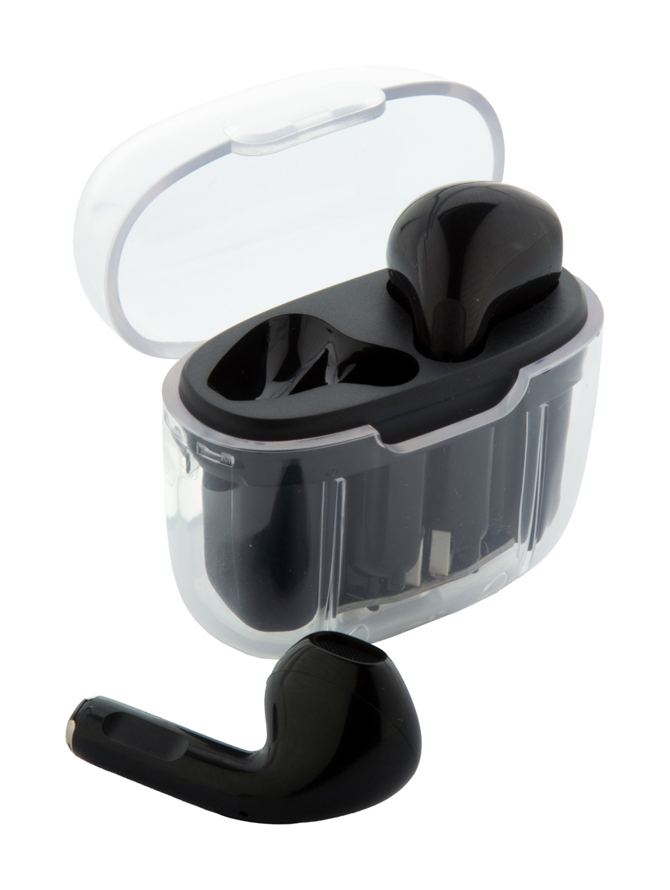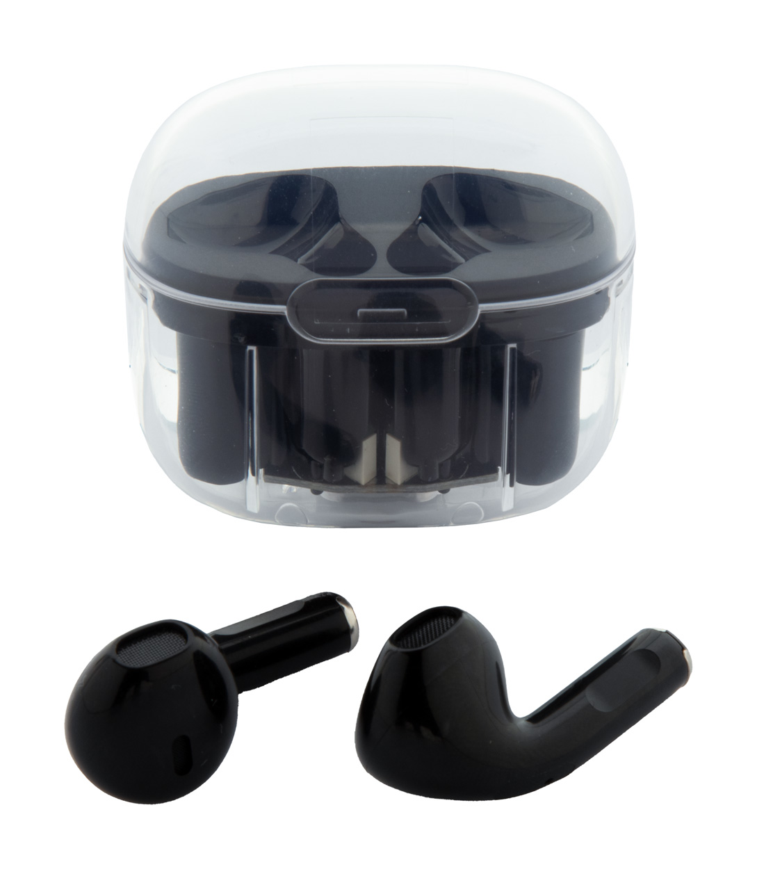 Ohrhörer aus recyceltem ABS-Kunststoff mit Freisprechfunktion, in transparentem Ladeetui. Inklusive USB-Ladekabel.