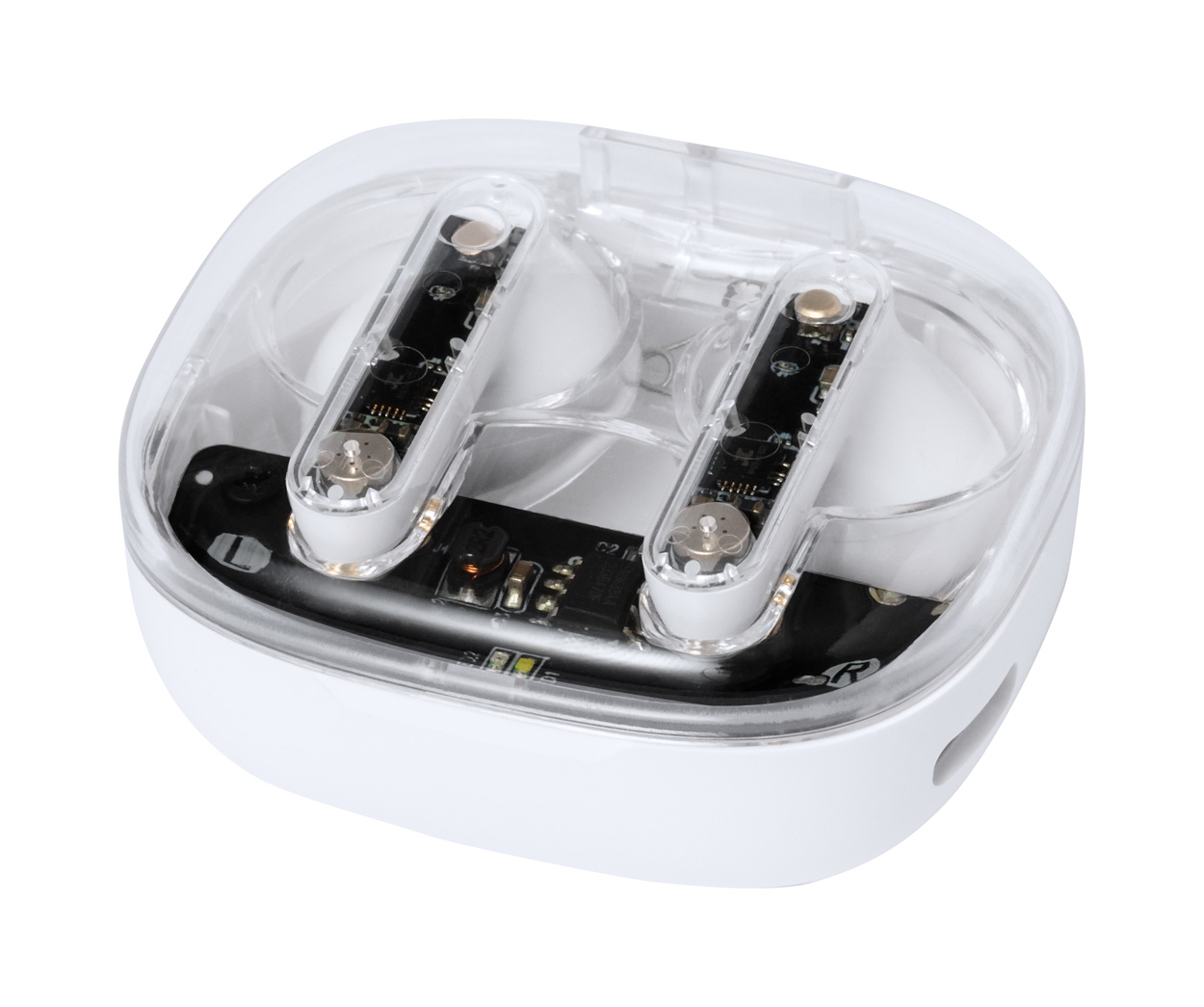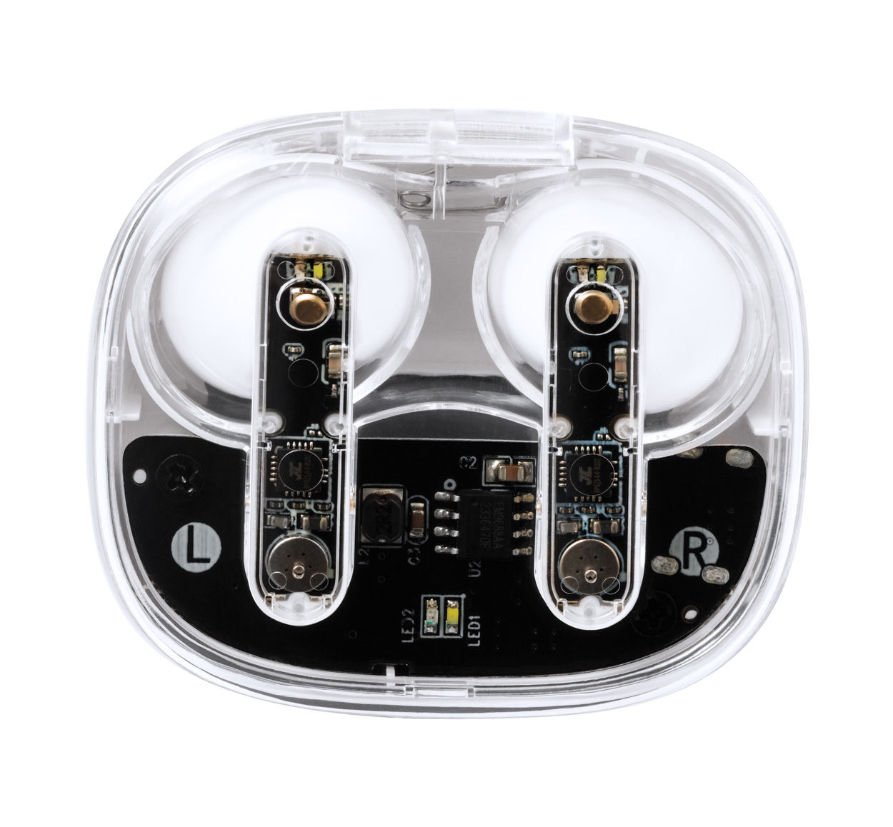 Semi-transparente, kabellose Stereo-Ohrhörer (TWS) mit sichtbaren elektronischen Komponenten und Freisprechfunktion. In halbtransparentem Kunststoff-Ladeetui. Inklusive USB-Ladekabel.