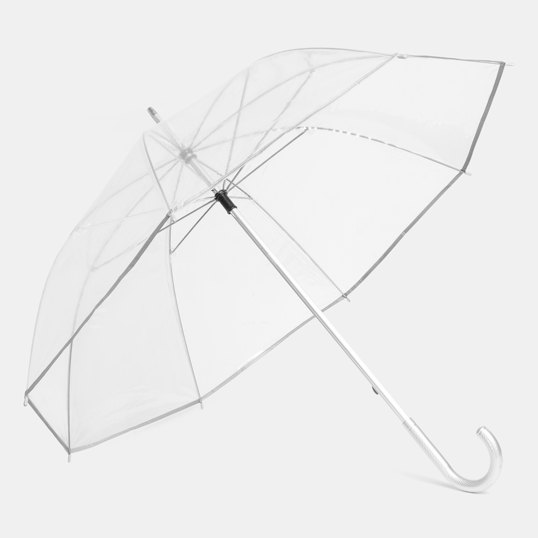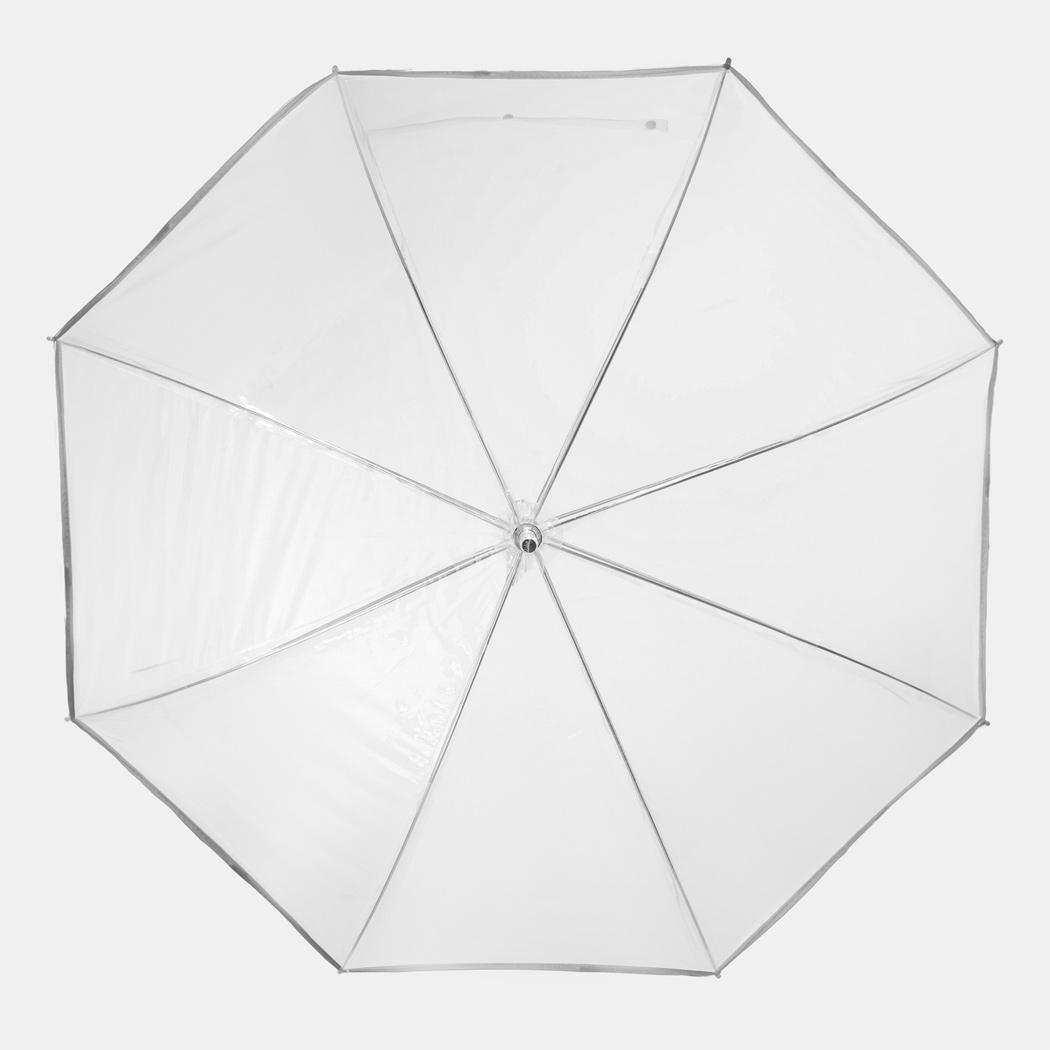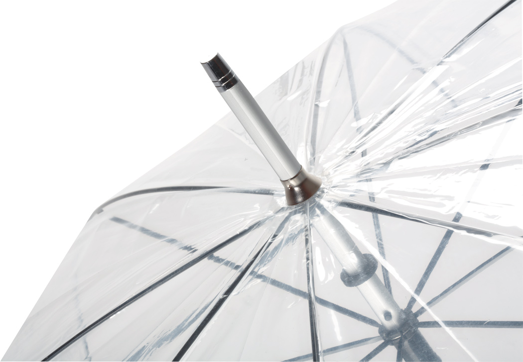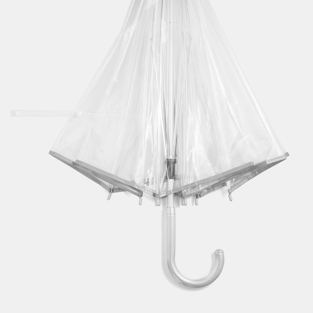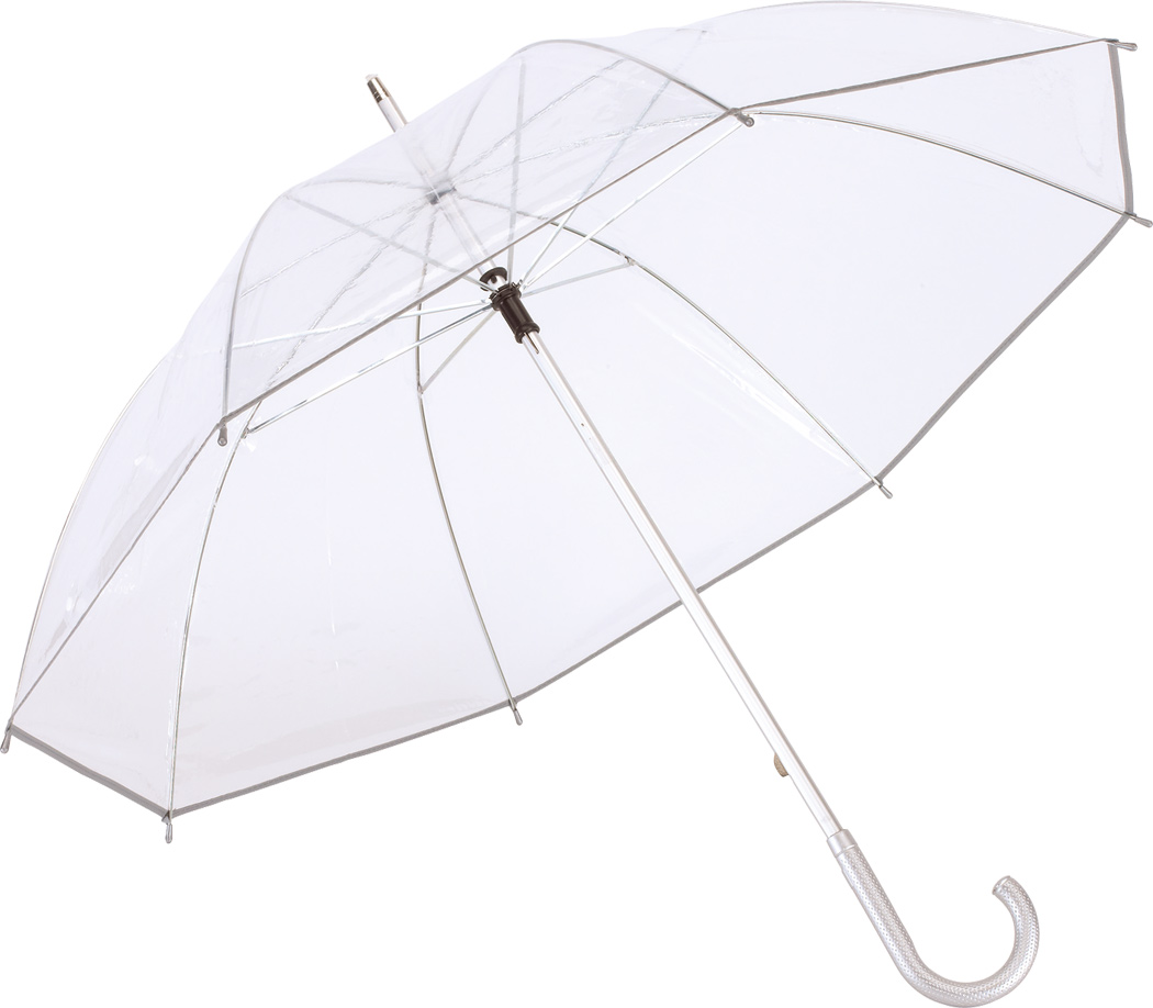 Transparenter Aluminium-Stockschirm PANORAMIX: Metallspeichen, Kunststofftips und -Rundhakengriff, POE-Bespannung mit silberfarbener Paspelierung und Druckknopfverschluss