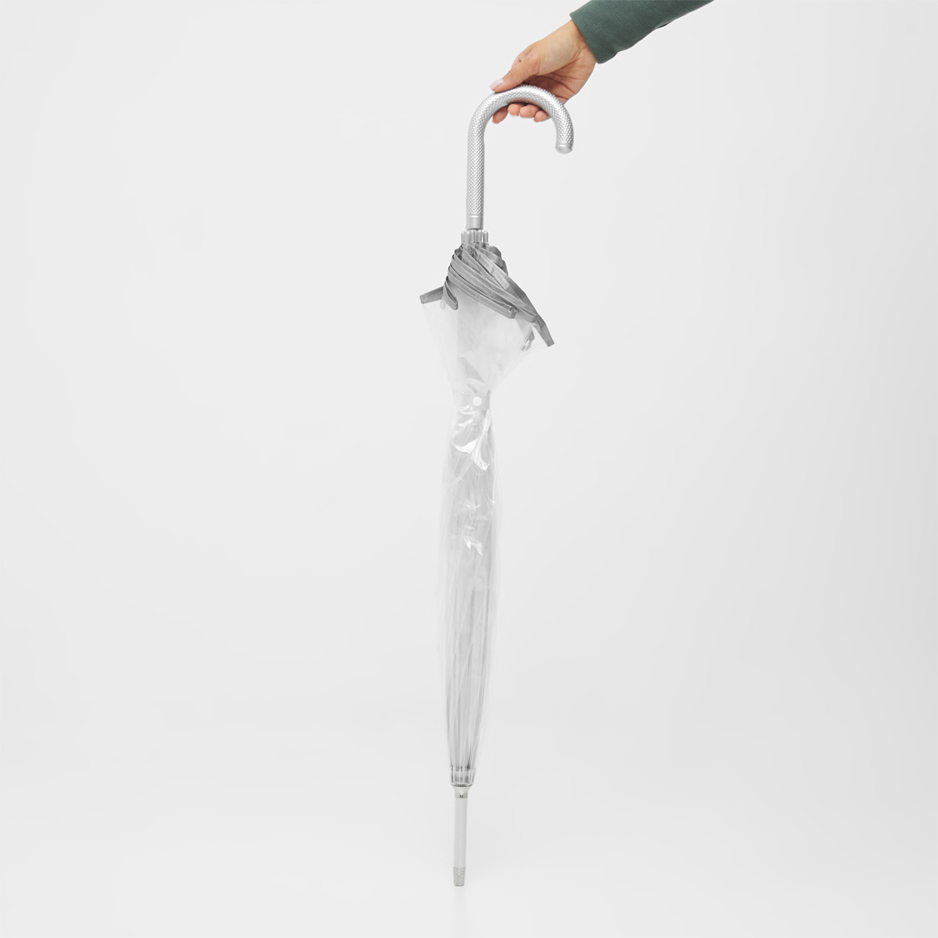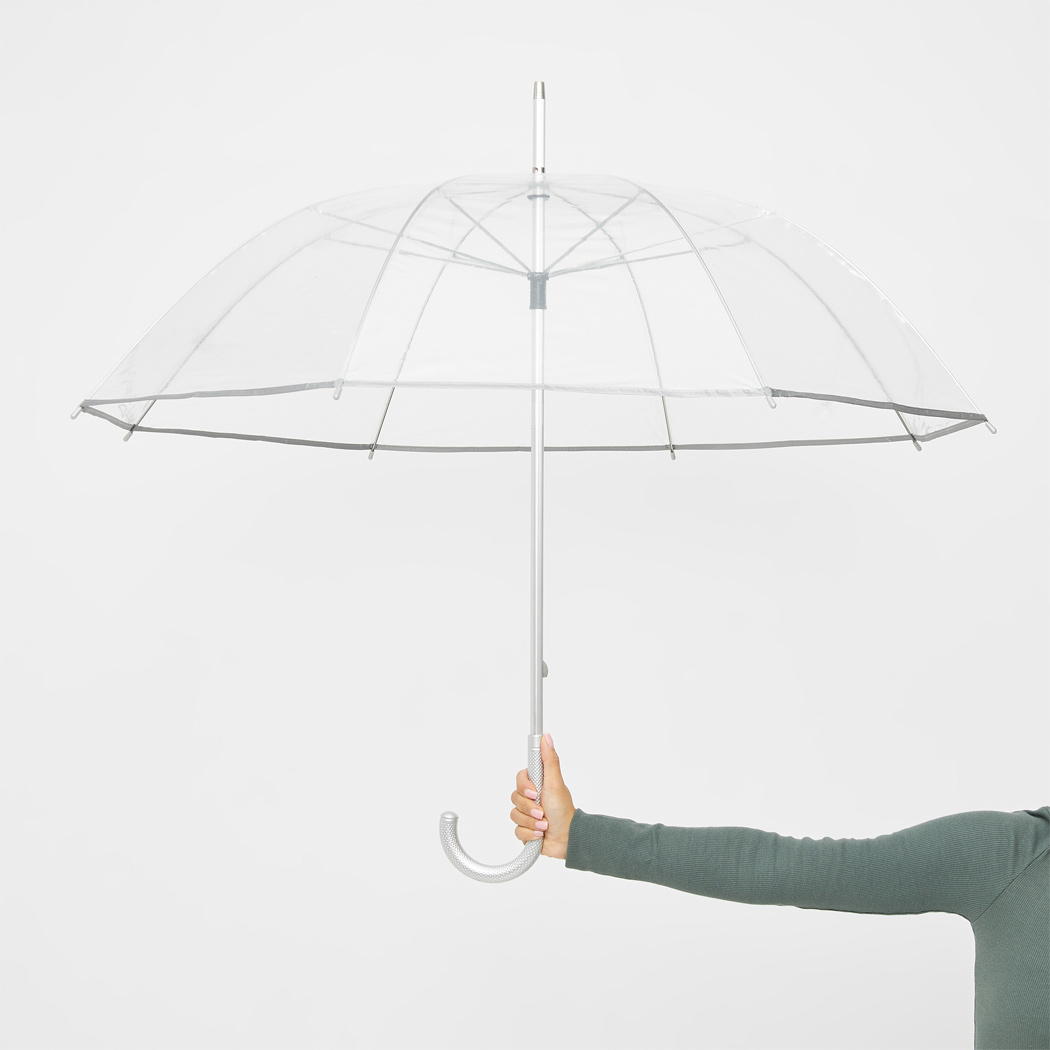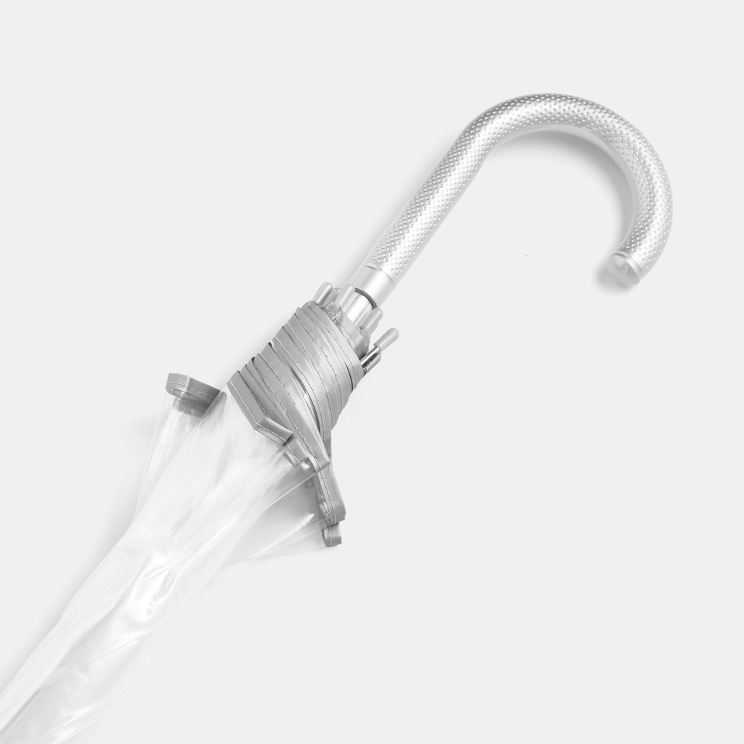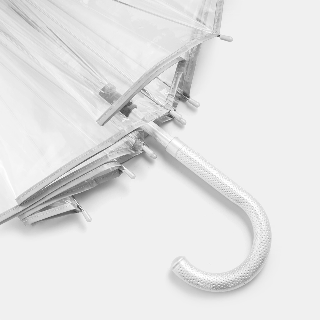 Transparenter Aluminium-Stockschirm PANORAMIX: Metallspeichen, Kunststofftips und -Rundhakengriff, POE-Bespannung mit silberfarbener Paspelierung und Druckknopfverschluss