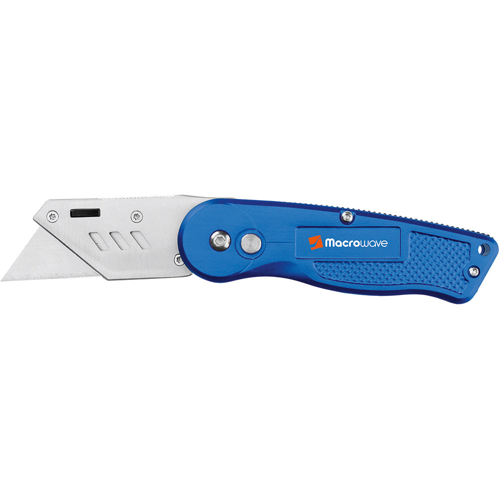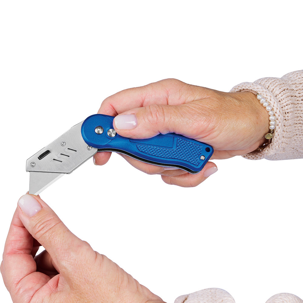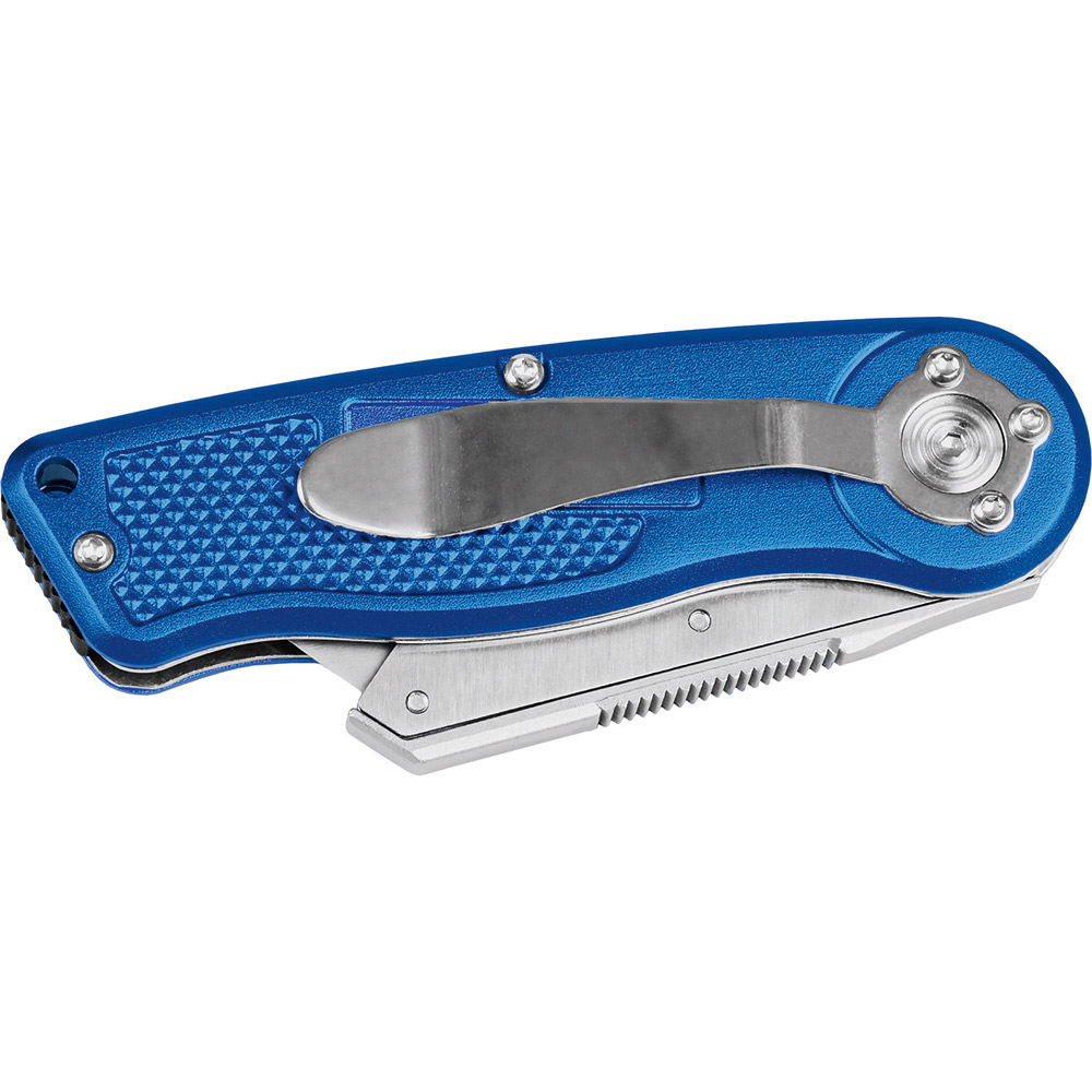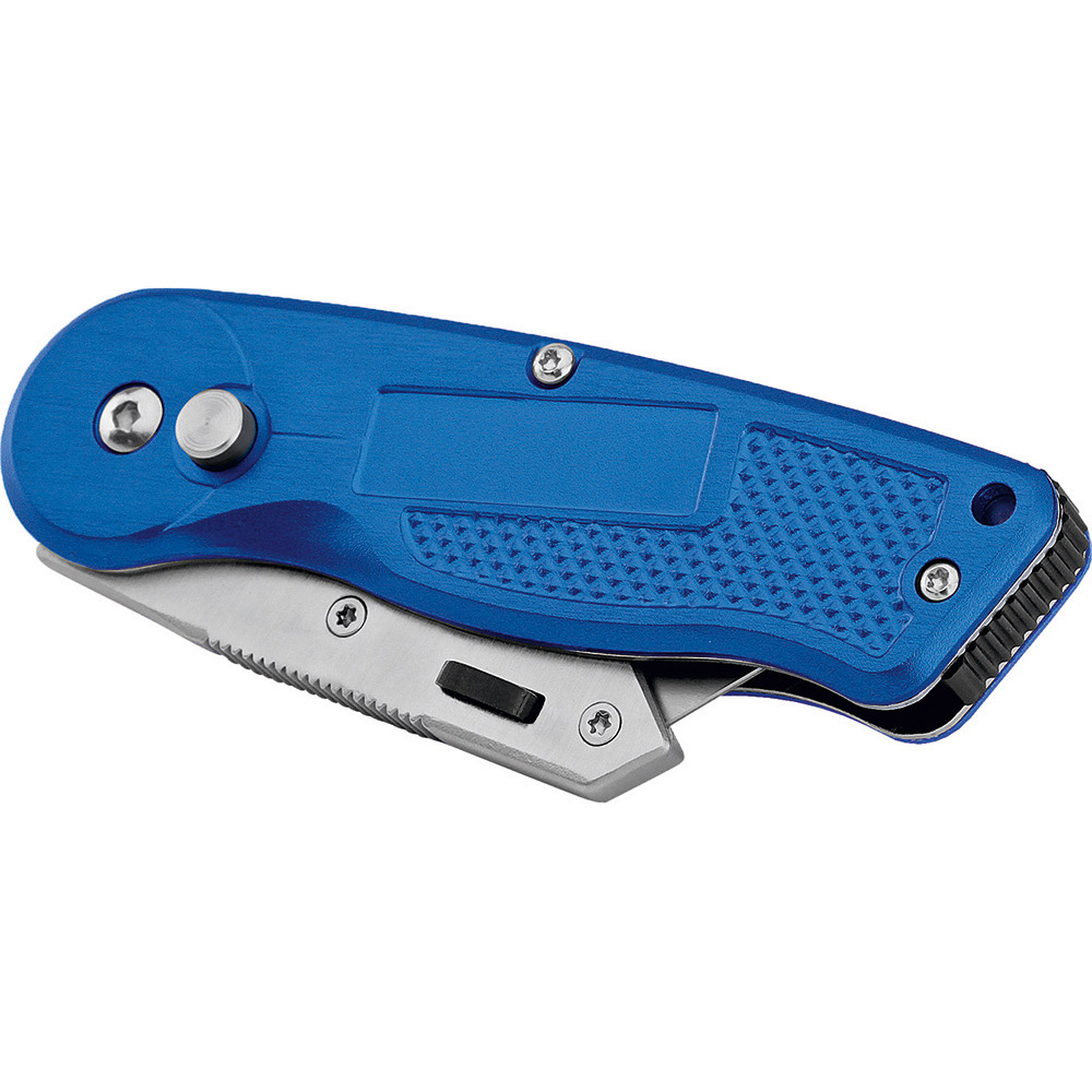 Durch den Feststellmechanismus wird der Klingenhalter arretiert. Eingeklappt kann das Messer nicht versehentlich geöffnet werden und in der Arbeitsposition bietet die Arretierung eine sichere Handhabung. Die Arretierung wird durch Knopfdruck gelöst. Für Rechts- und Linkshänder geeignet. Material: Aluminium eloxiert, Klingenhalter aus Edelstahl. Klinge: Trapezklinge aus SK5 Carbonstahl, Rockwell 58~62 HRC (mittlere Qualitätsstufe), max. Schnitttiefe 35 mm, 2-fach nutzbar durch 2-seitigen Schliff. Funktionen: Klingenwechsel ohne Hilfsmittel, Feststellmechanismus für den Trapezklingenhalter, Daumenknopf für das Öffnen / Schließen mit einer Hand, Gürtelclip, Öse zum Anbringen eines Lanyards oder Fangriemen. Zubehör: Nylon-Gürteltasche. Verpackung: schwarze Geschenkverpackung.