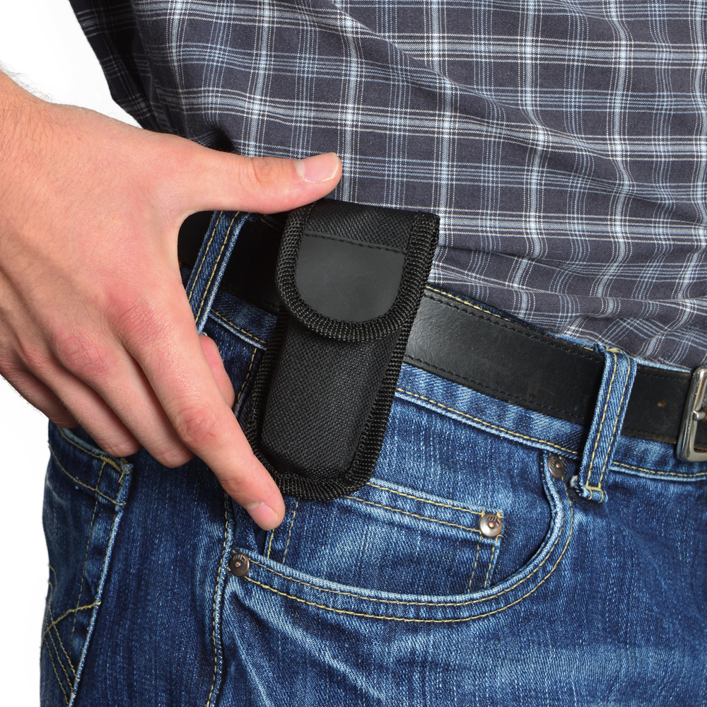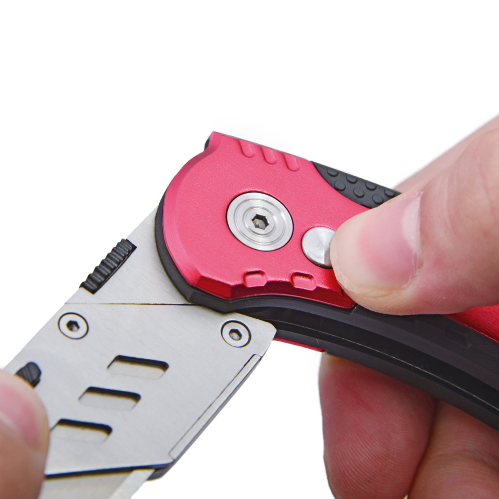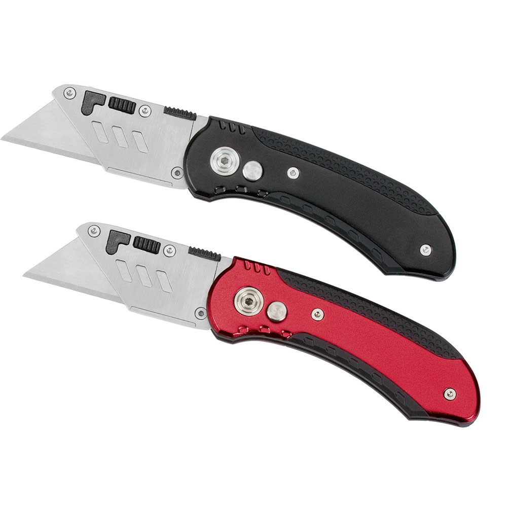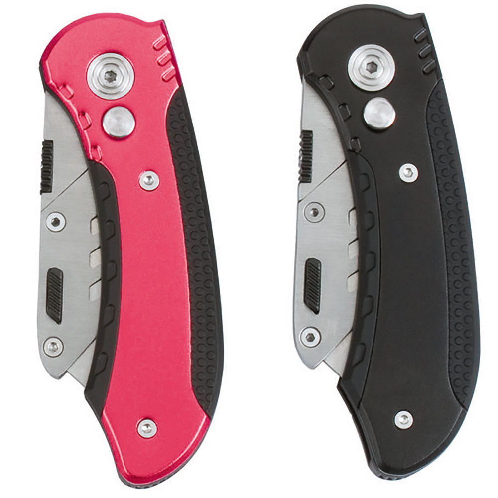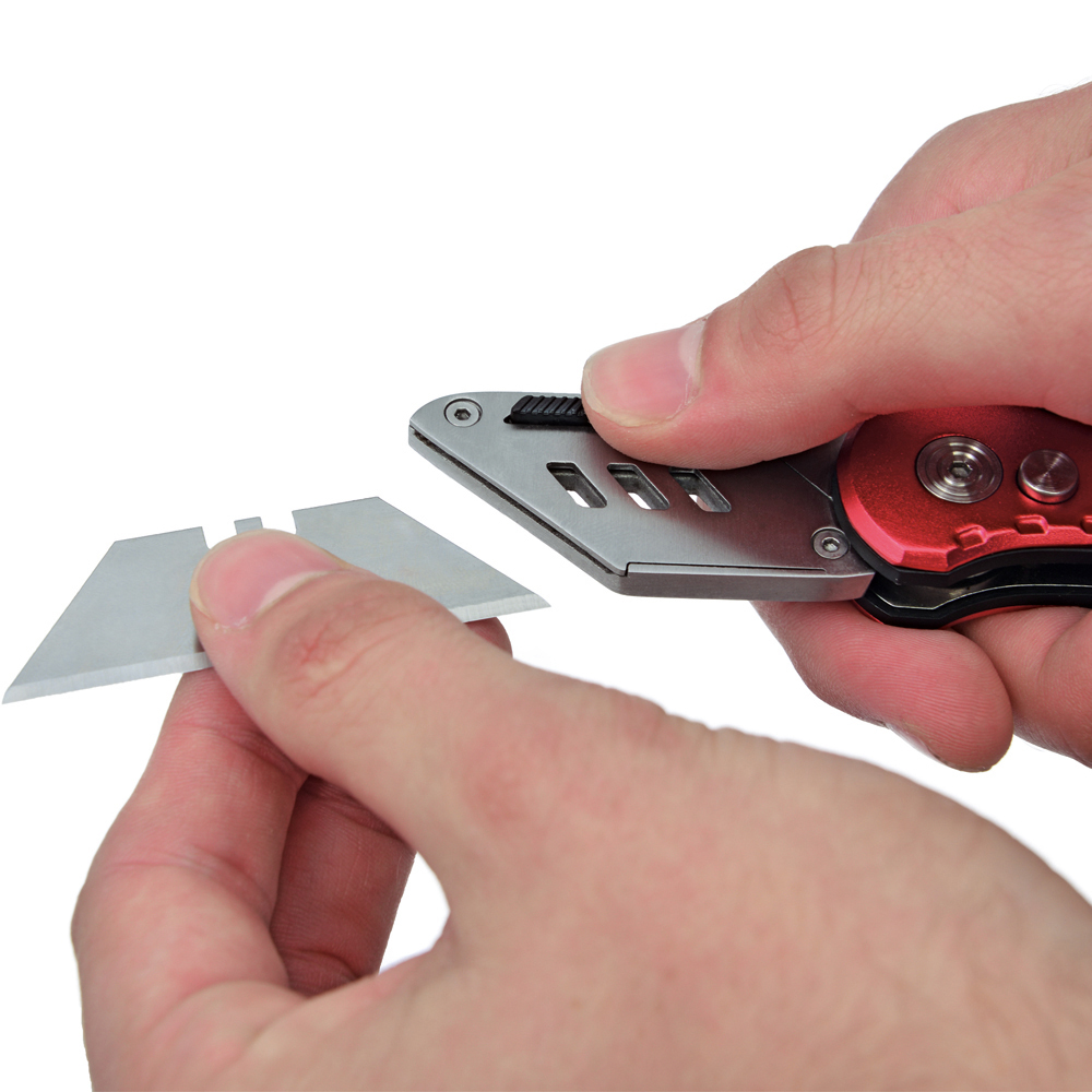 Durch den Feststellmechanismus wird der Klingenhalter arretiert. Eingeklappt kann das Messer nicht versehentlich geöffnet werden und in der Arbeitsposition bietet die Arretierung eine sichere Handhabung. Die Arretierung wird durch Knopfdruck gelöst. Für Rechts- und Linkshänder geeignet. Material: Aluminium eloxiert, Klingenhalter aus Edelstahl. Klinge: Trapezklinge aus SK5 Carbonstahl, Rockwell 58~62 HRC (mittlere Qualitätsstufe), max. Schnitttiefe 24 mm, 2-fach nutzbar durch 2-seitigen Schliff. Funktionen: Klingenwechsel ohne Hilfsmittel, Feststellmechanismus für den Klingenhalter, Daumenknopf für das Öffnen / Schließen mit einer Hand, Gürtelclip. Zubehör: Nylon-Gürteltasche. Verpackung: schwarze Geschenkverpackung.