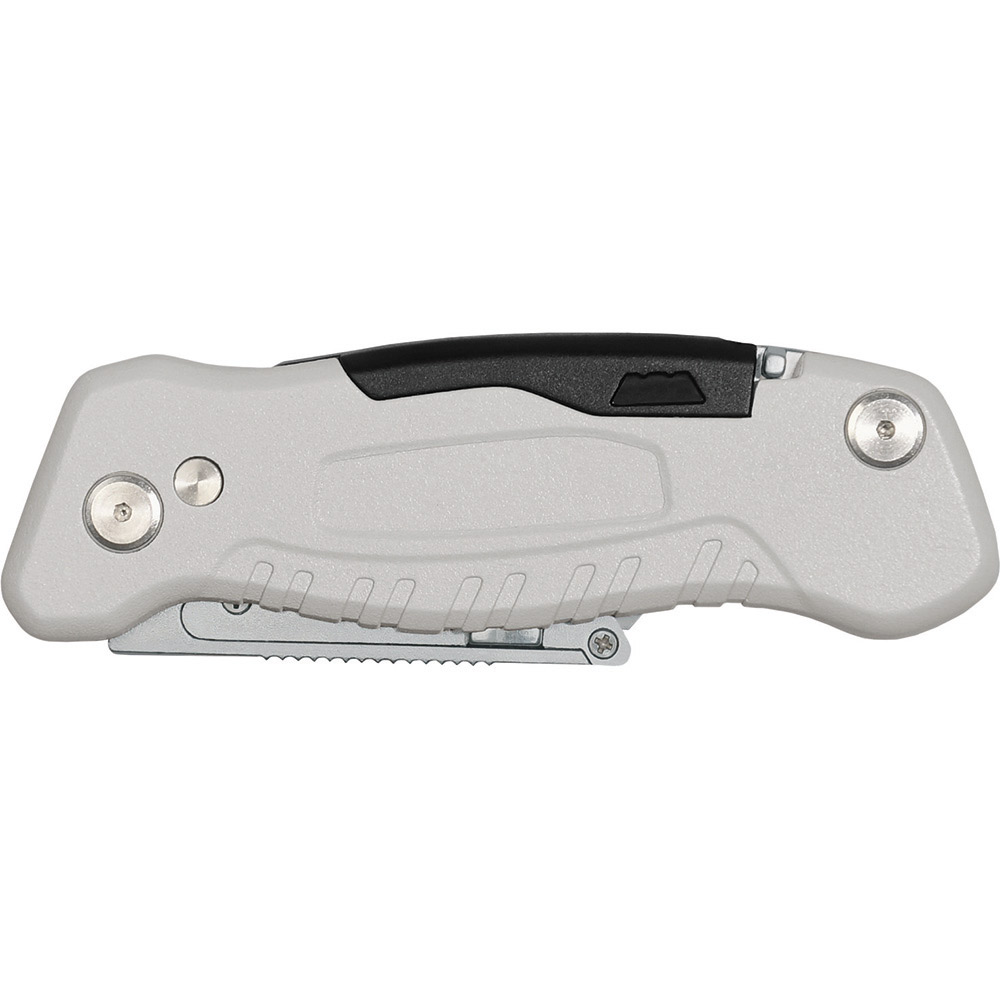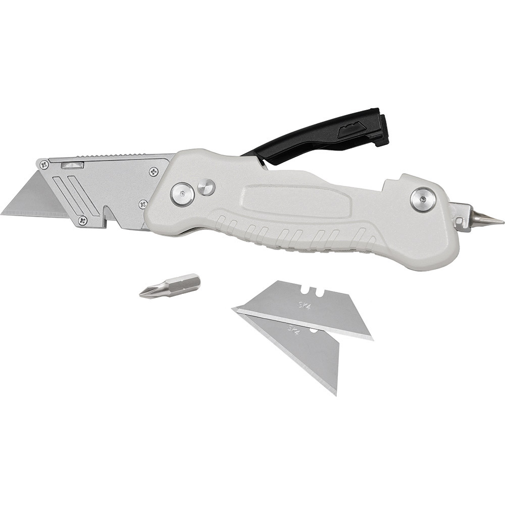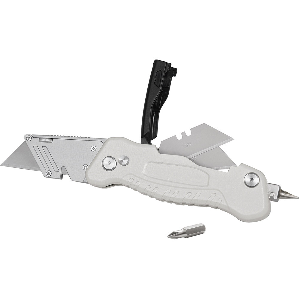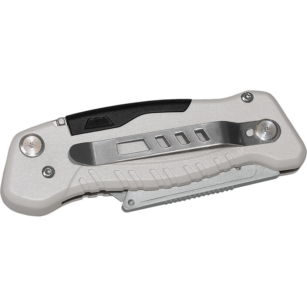 Hochwertiges, absolut robustes und langlebiges Sicherheits-Trapezklingen-Klappmesser mit integriertem Abisolierer und Schraubendreher. Durch den Feststellmechanismus kann der Klingenhalter in 3 Positionen arretiert werden. Die Arretierung wird durch Knopfdruck gelöst. In der Arbeitsposition bietet die Arretierung eine absolut sichere Handhabung. Eingeklappt kann das Messer nicht versehentlich geöffnet werden. Im Gehäuse befindet sich ein Schraubendreher mit magnetischem Bithalter sowie 2 Bits. Mit dem integrierten Abisolierer, entfernen Sie die Isolierung von Kabeln einfach und sicher. Für Rechts- und Linkshänder geeignet. Material: Gehäuse und Klingenhalter aus Zink-Alloy Legierung, Ersatzklingenfach aus ABS, Bits aus S2 Edelstahl Klinge: Trapezklinge aus SK4 Carbonstahl, Rockwell 53~58 HRC, max. Schnitttiefe 20 mm, 2-fach nutzbar durch 2-seitigen Schliff. Funktionen: 3-stufiger Feststellmechanismus für den Klingenhalter, Daumenknopf für das Öffnen / Schließen mit einer Hand, Abisolierer, Schraubendreher, Klingenwechsel ohne Hilfsmittel, Gürtelclip. Zubehör: Klingenschutz, 2 Ersatzklingen in einem Klingenfach im Gehäuse, 2 x S2 Bits (1/4" (6,35 mm) Sechskanntschaft, Länge 25mm): Phillips: PH1, Schlitz: 5 mm. Verpackung: schwarze Geschenkverpackung