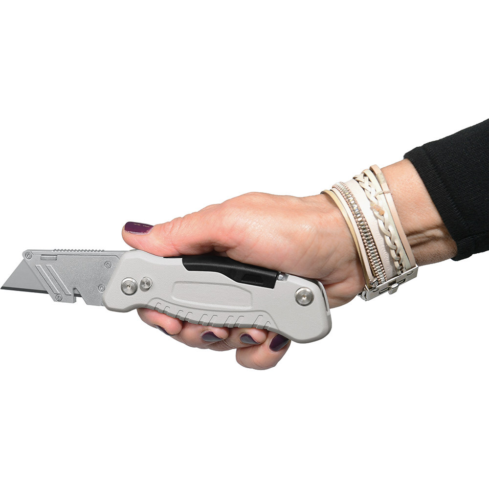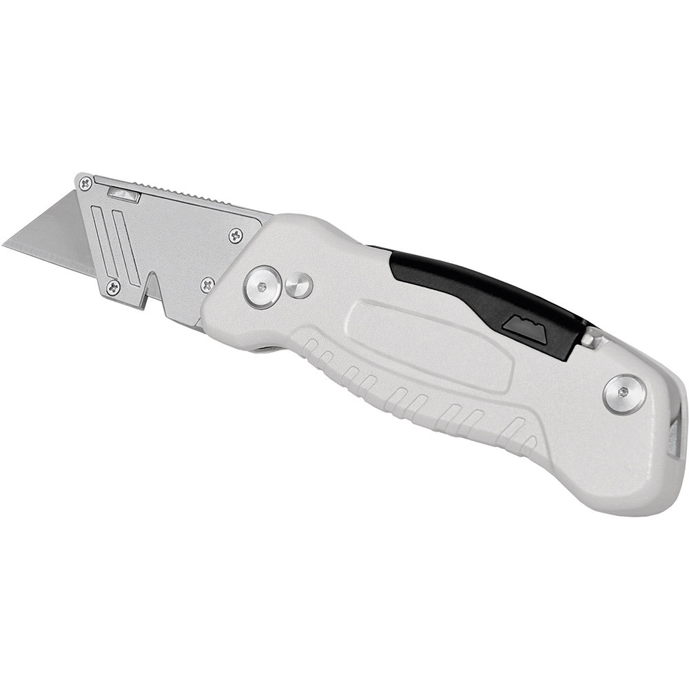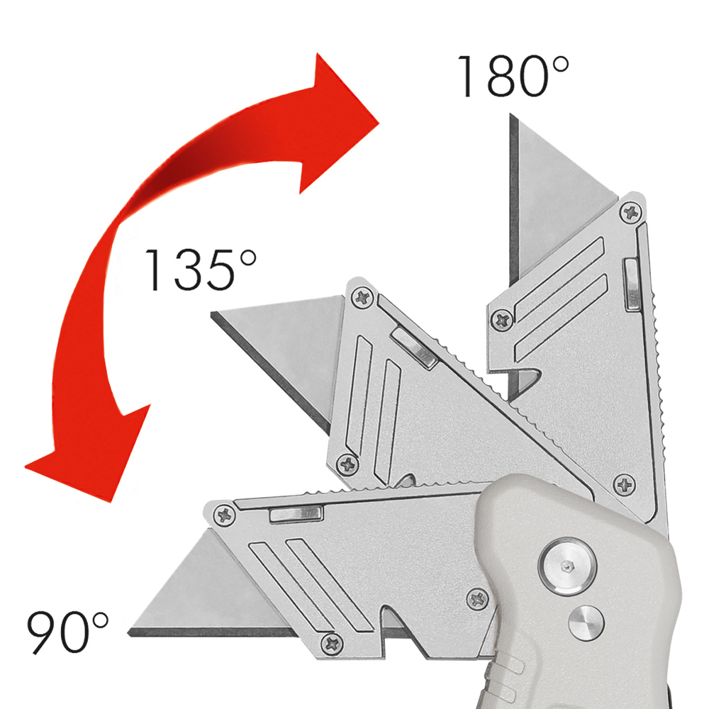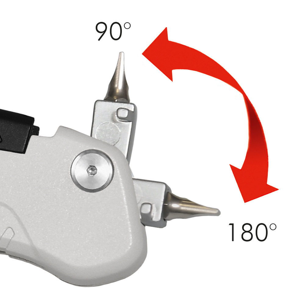 Hochwertiges, absolut robustes und langlebiges Sicherheits-Trapezklingen-Klappmesser mit integriertem Abisolierer und Schraubendreher. Durch den Feststellmechanismus kann der Klingenhalter in 3 Positionen arretiert werden. Die Arretierung wird durch Knopfdruck gelöst. In der Arbeitsposition bietet die Arretierung eine absolut sichere Handhabung. Eingeklappt kann das Messer nicht versehentlich geöffnet werden. Im Gehäuse befindet sich ein Schraubendreher mit magnetischem Bithalter sowie 2 Bits. Mit dem integrierten Abisolierer, entfernen Sie die Isolierung von Kabeln einfach und sicher. Für Rechts- und Linkshänder geeignet. Material: Gehäuse und Klingenhalter aus Zink-Alloy Legierung, Ersatzklingenfach aus ABS, Bits aus S2 Edelstahl Klinge: Trapezklinge aus SK4 Carbonstahl, Rockwell 53~58 HRC, max. Schnitttiefe 20 mm, 2-fach nutzbar durch 2-seitigen Schliff. Funktionen: 3-stufiger Feststellmechanismus für den Klingenhalter, Daumenknopf für das Öffnen / Schließen mit einer Hand, Abisolierer, Schraubendreher, Klingenwechsel ohne Hilfsmittel, Gürtelclip. Zubehör: Klingenschutz, 2 Ersatzklingen in einem Klingenfach im Gehäuse, 2 x S2 Bits (1/4" (6,35 mm) Sechskanntschaft, Länge 25mm): Phillips: PH1, Schlitz: 5 mm. Verpackung: schwarze Geschenkverpackung