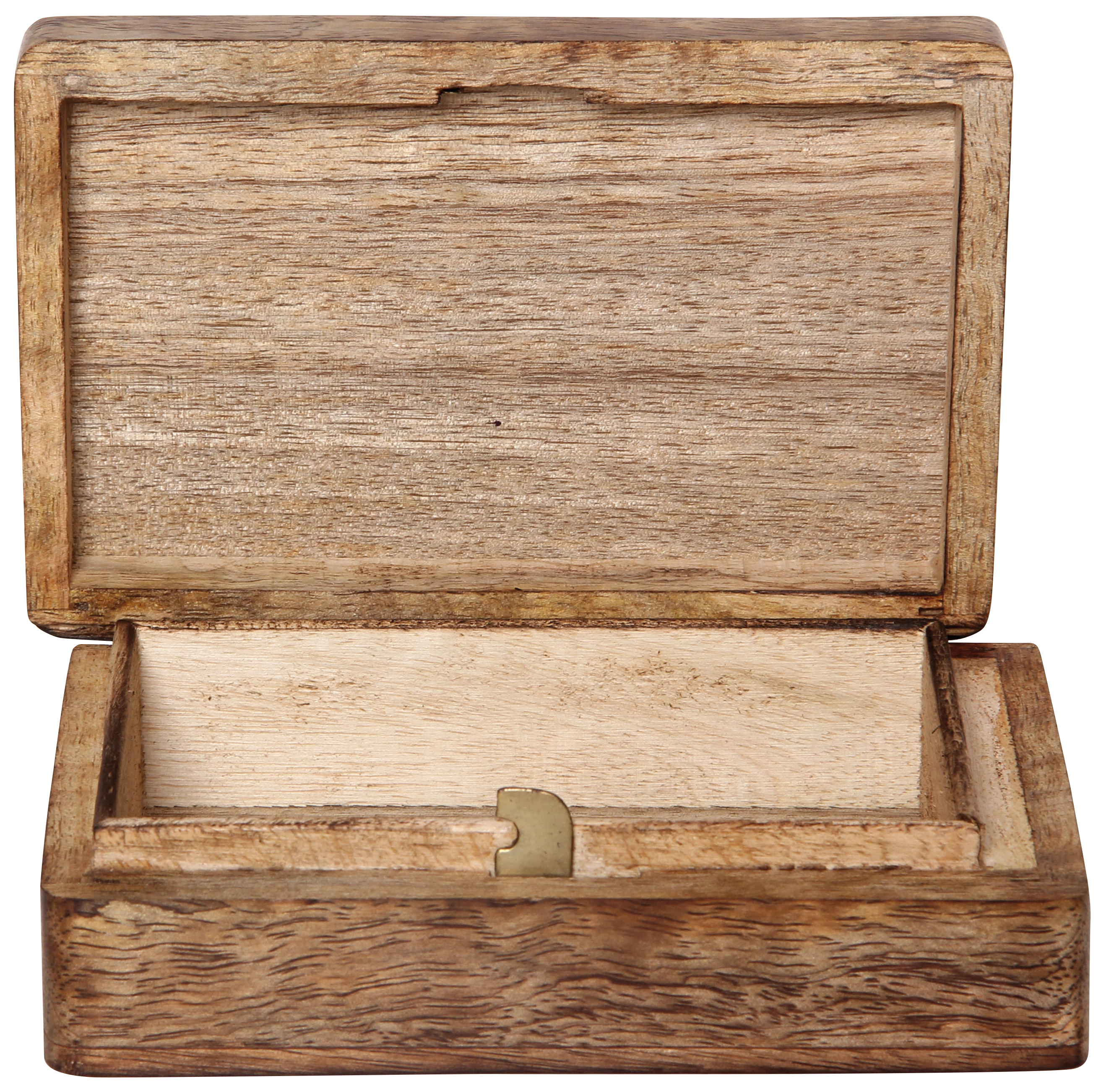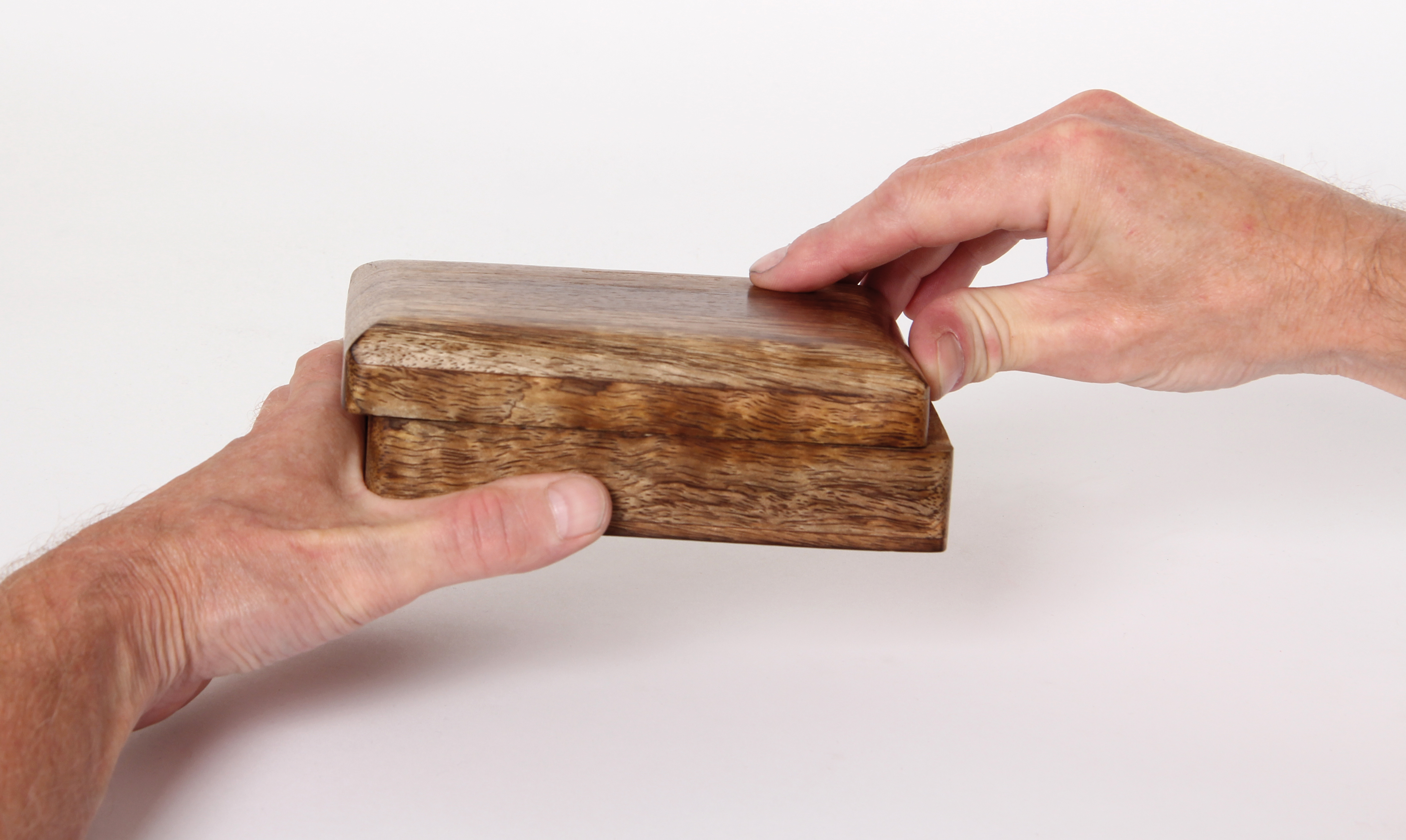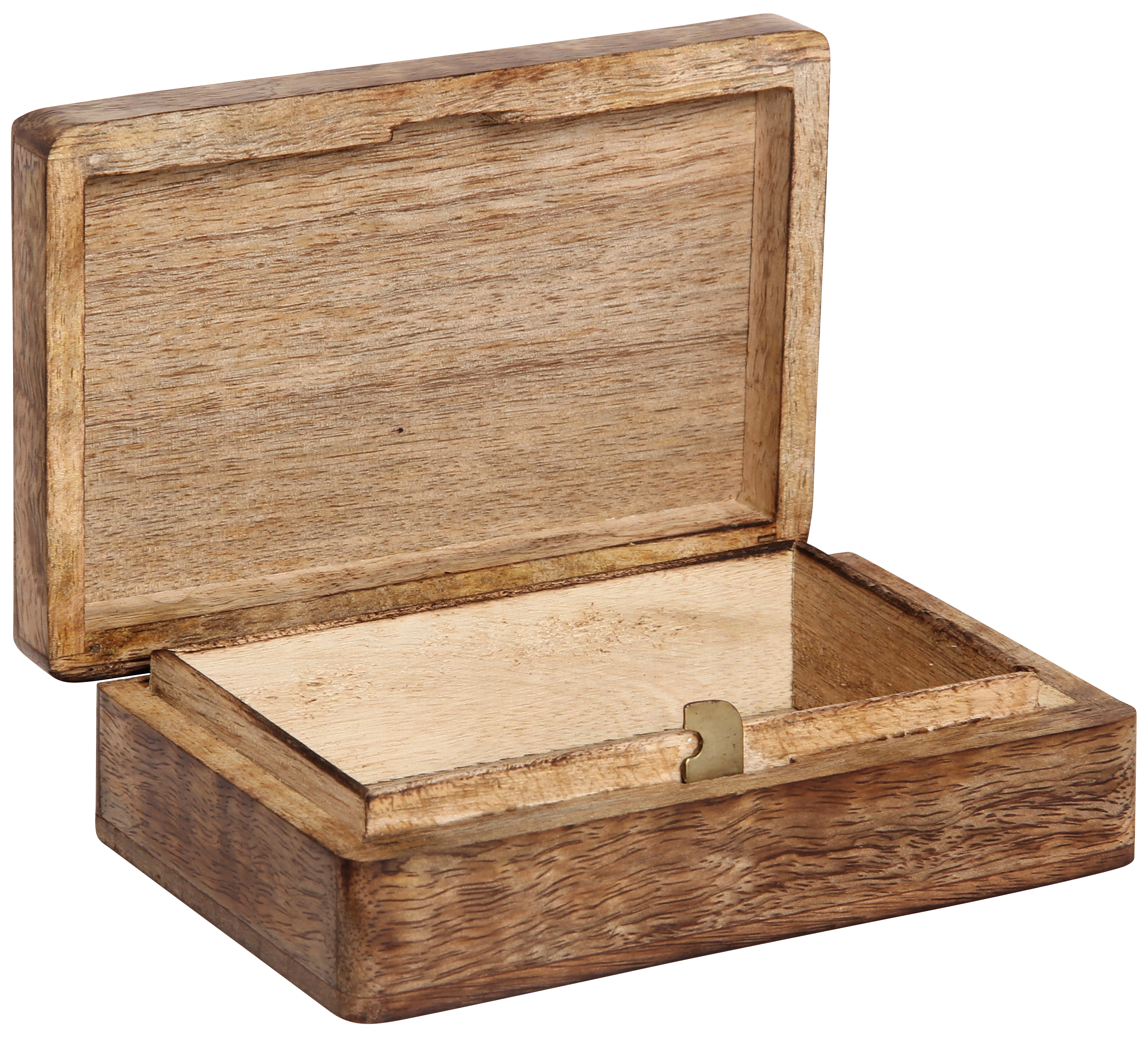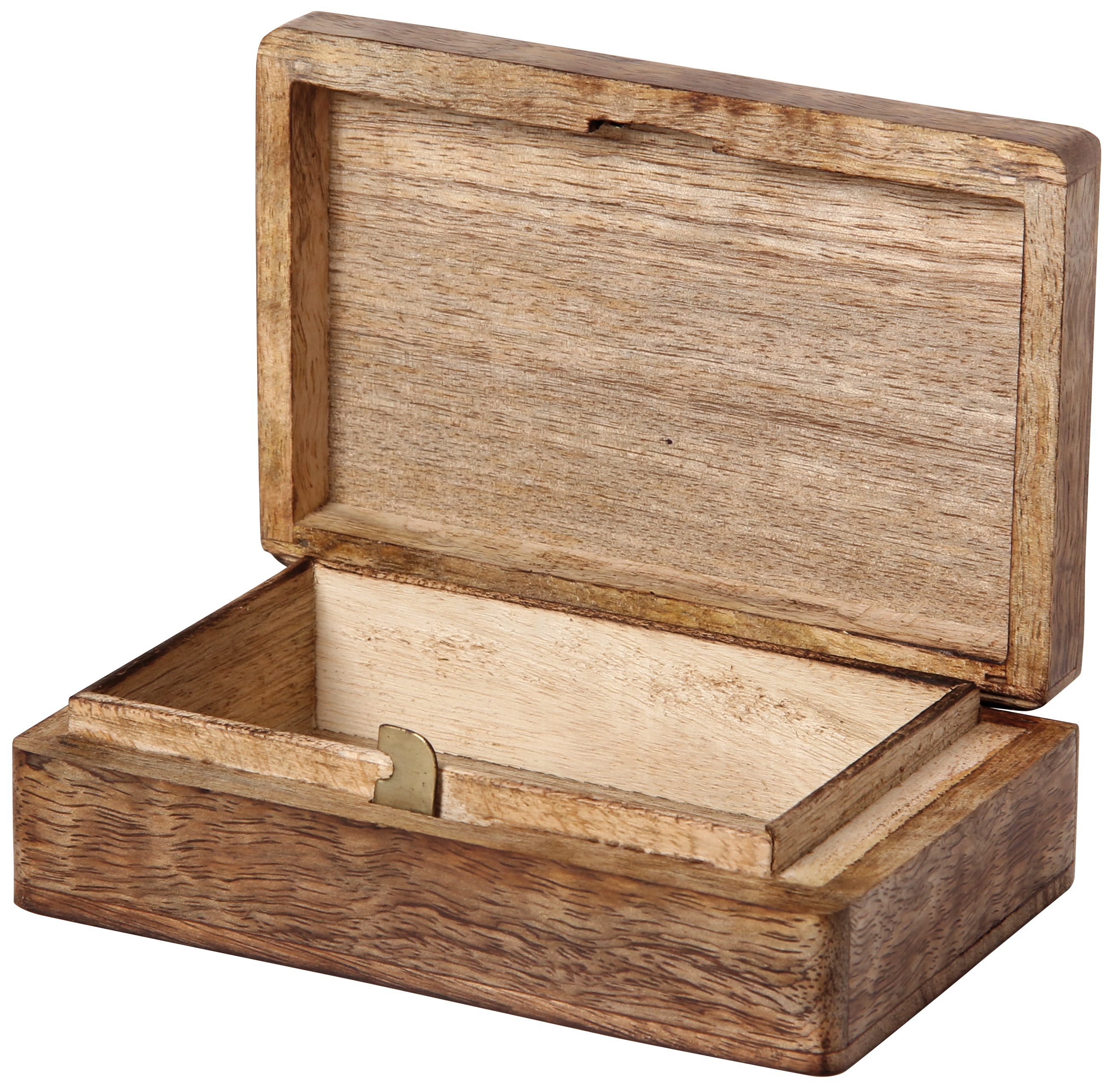 Als Versteck für kleine Schätze oder Geschenkverpackung mit dem gewissen Trick. Handgefertigt aus Mangoholz. Innenraum: ca. 12 x 7 x 3 cm. Schiebt man den Deckel etwas zur Seite läßt er sich nach oben öffnen.