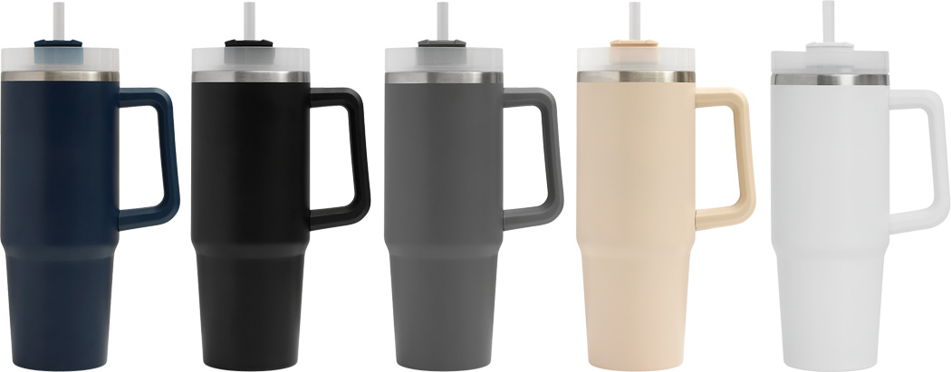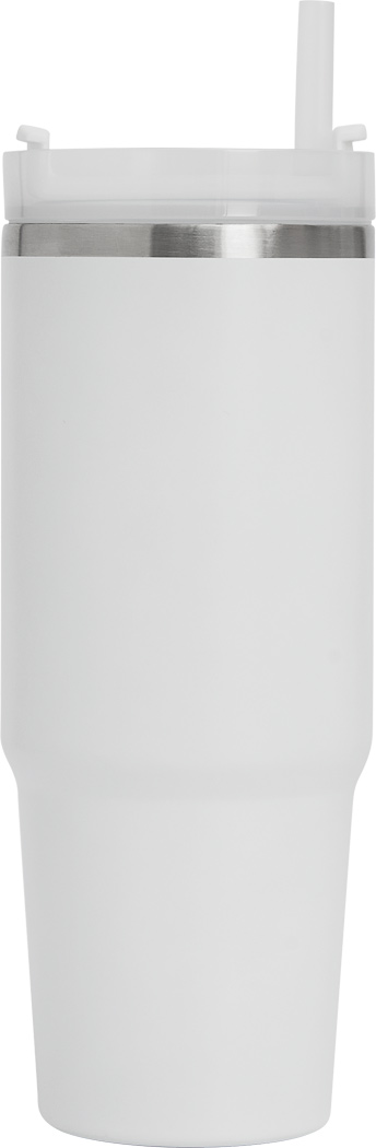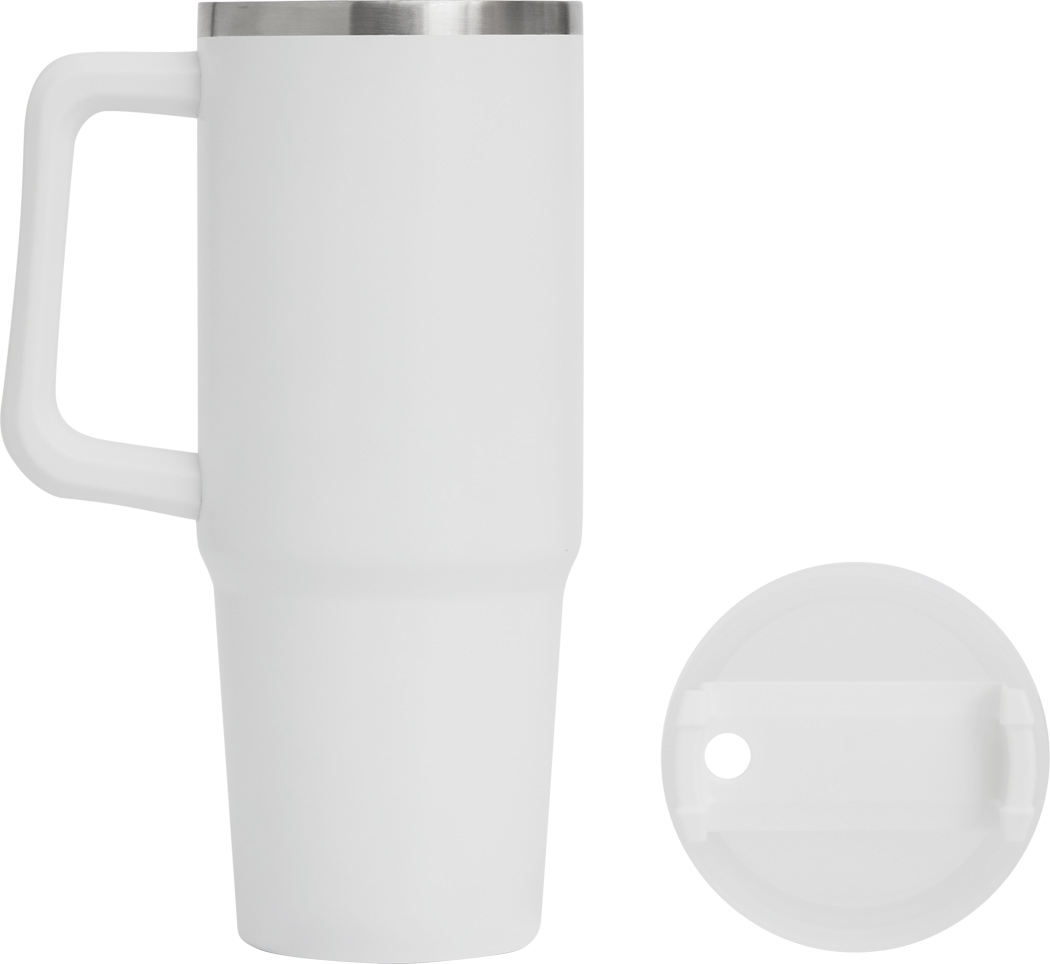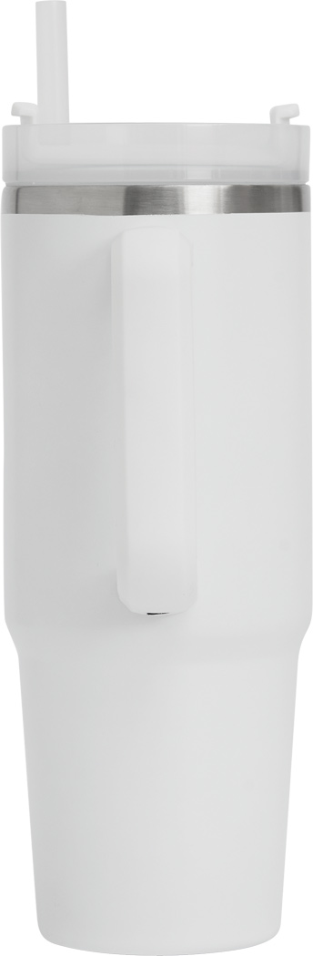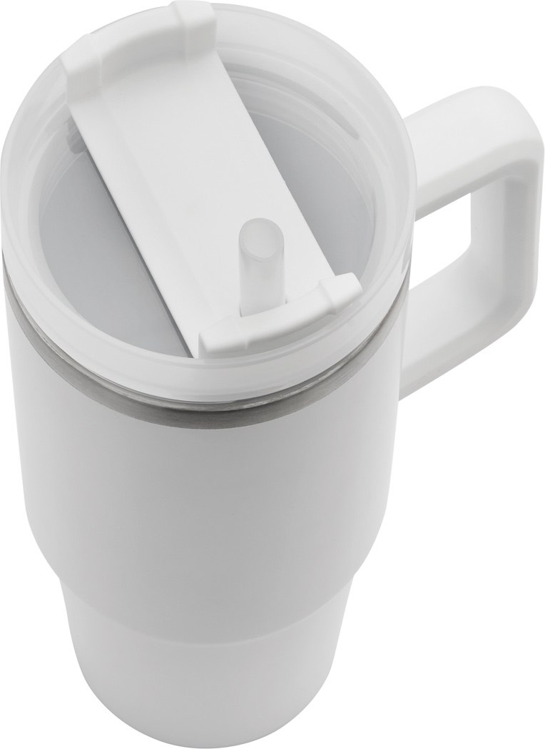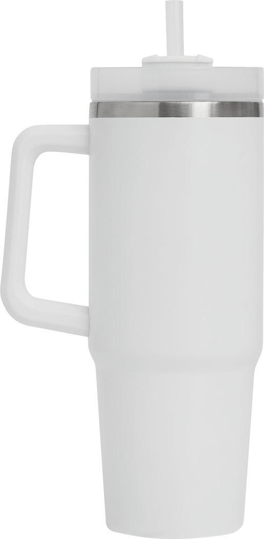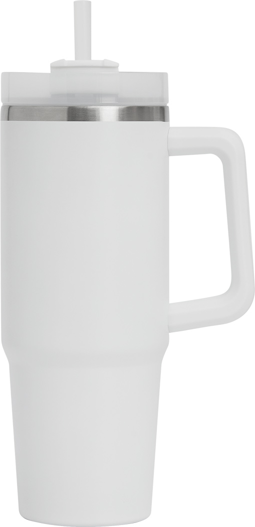 Vakuum-Isolierbecher DRINK DELUXE, doppelwandig: innen und außen aus Edelstahl, mit praktischem Griff, milchig-transparenter Kunststoff-Deckel mit sicherem Schraubverschluss, Silikon-Dichtring, Trinköffnung mit Drehverschluss und transparentem Strohhalm, beschichteter Boden für gute Oberflächenhaftung, Füllmenge ca. 900 ml, hält ca. 5 Stunden warm und bis zu 10 Stunden kalt, in Box