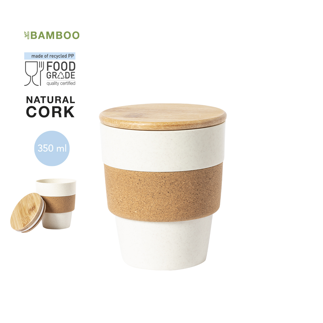 Naturlinie Becher mit einem Fassungsvermögen von 350 ml. Hergestellt aus geädertem PP mit Außenband aus Naturkork und Deckel aus Bambus. Lebensmittelzertifizierung, die die Sicherheit garantiert wenn Lebensmittel mit dem zur Herstellung des Produkts verwendeten Material in Berührung kommen. Präsentiert in einer attraktiven Ökodesign-Box.