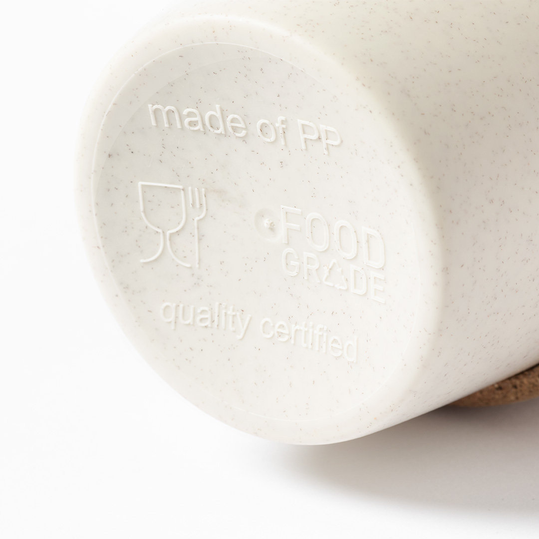 Naturlinie Becher mit einem Fassungsvermögen von 350 ml. Hergestellt aus geädertem PP mit Außenband aus Naturkork und Deckel aus Bambus. Lebensmittelzertifizierung, die die Sicherheit garantiert wenn Lebensmittel mit dem zur Herstellung des Produkts verwendeten Material in Berührung kommen. Präsentiert in einer attraktiven Ökodesign-Box.