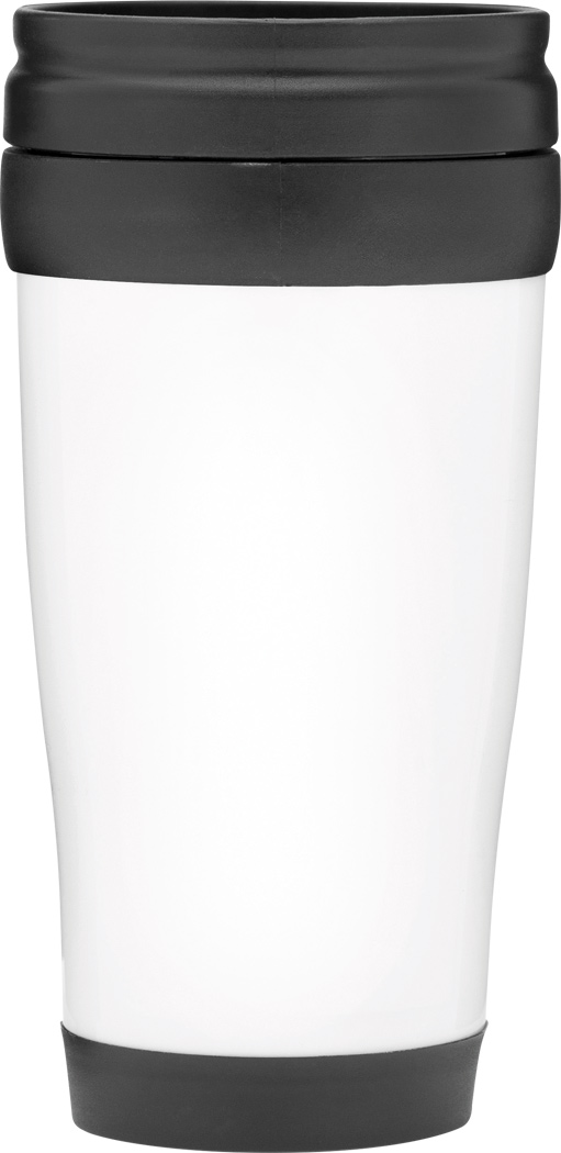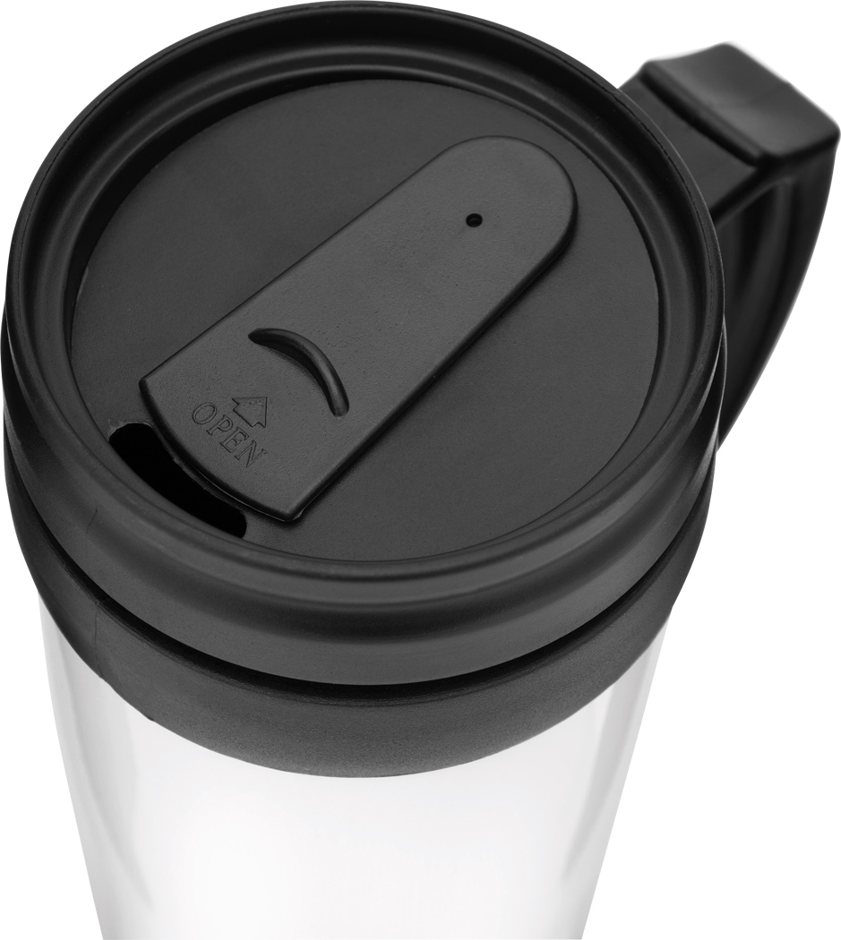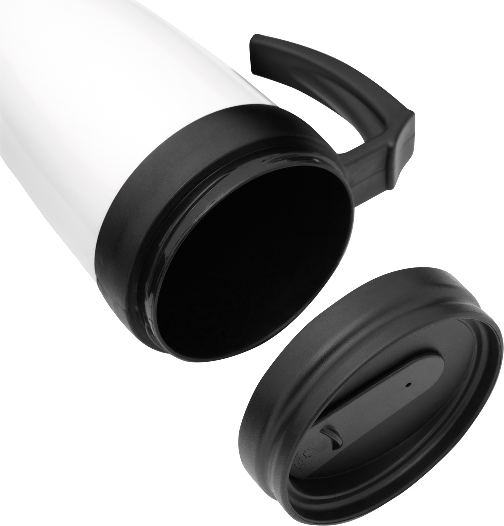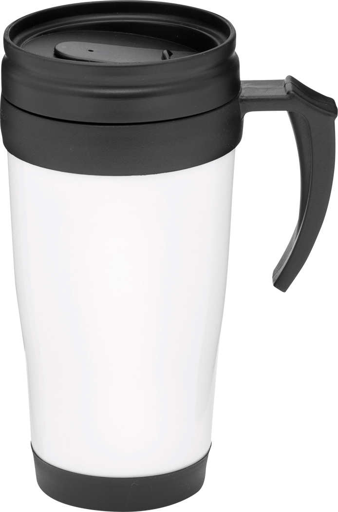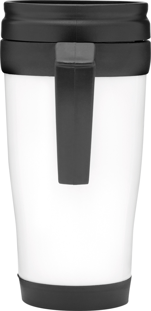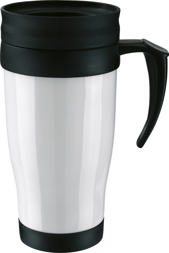 Trinkbecher WARM-UP, doppelwandig: innen und außen aus Kunststoff, mit praktischem Kunststoffgriff und Trinköffnung im Deckel, Füllmenge ca. 400 ml
