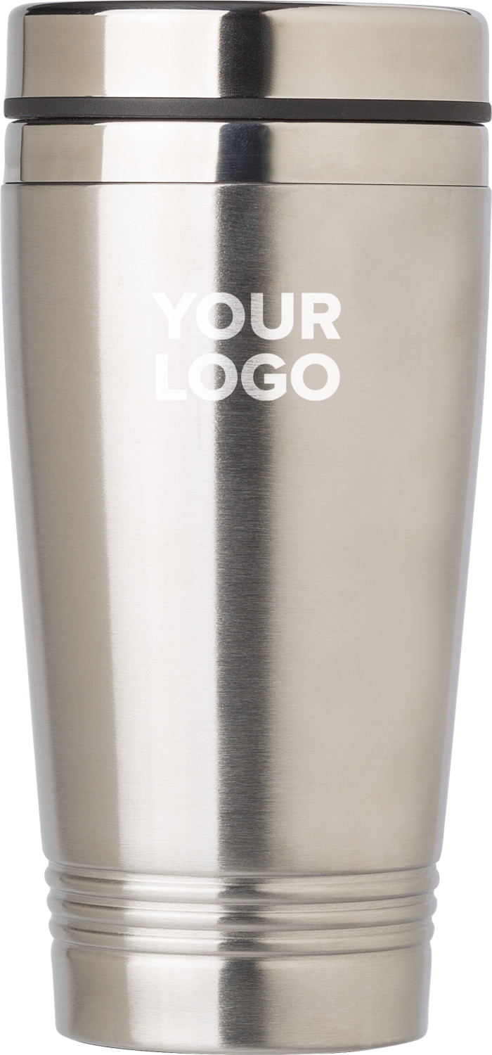 Edelstahl-Trinkbecher (450ml) mit Deckel. Geeignet für heiße Inhalte bis zu einer Temperatur von 70 Grad. Der Deckel hat eine Schiebeöffnung zum trinken. Anti-Rutsch-Boden und ist einzeln verpackt in einer braunen Kartonage.