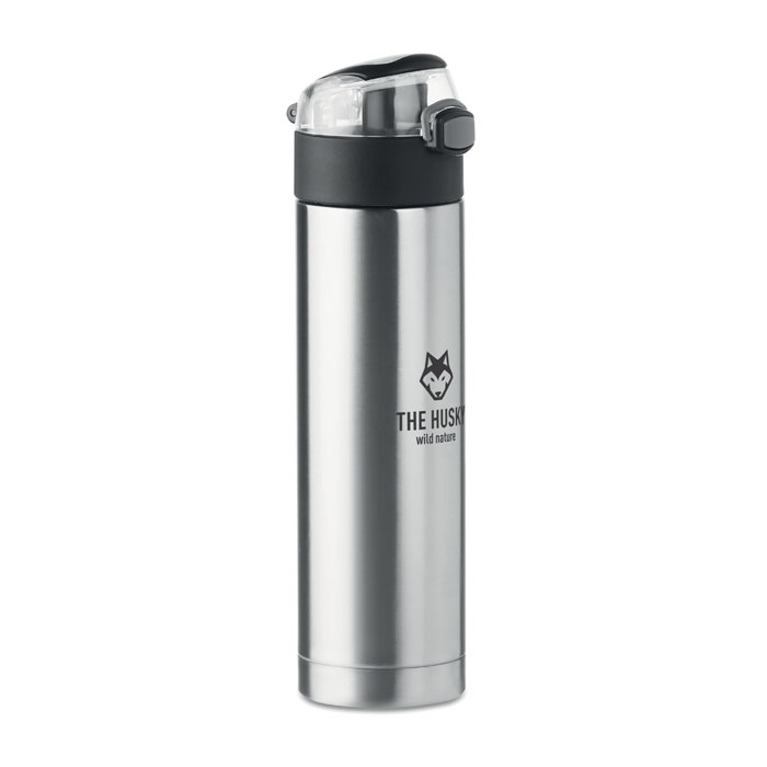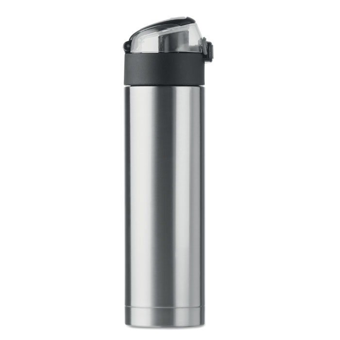 Doppelwandige Trinkflasche aus Edelstahl mit Sicherheitsverschluss im Deckel und Öffnen-durch-Drücken Funktion. Mit faltbarem Griff. Füllmenge: 400 ml. Auslaufsicher.