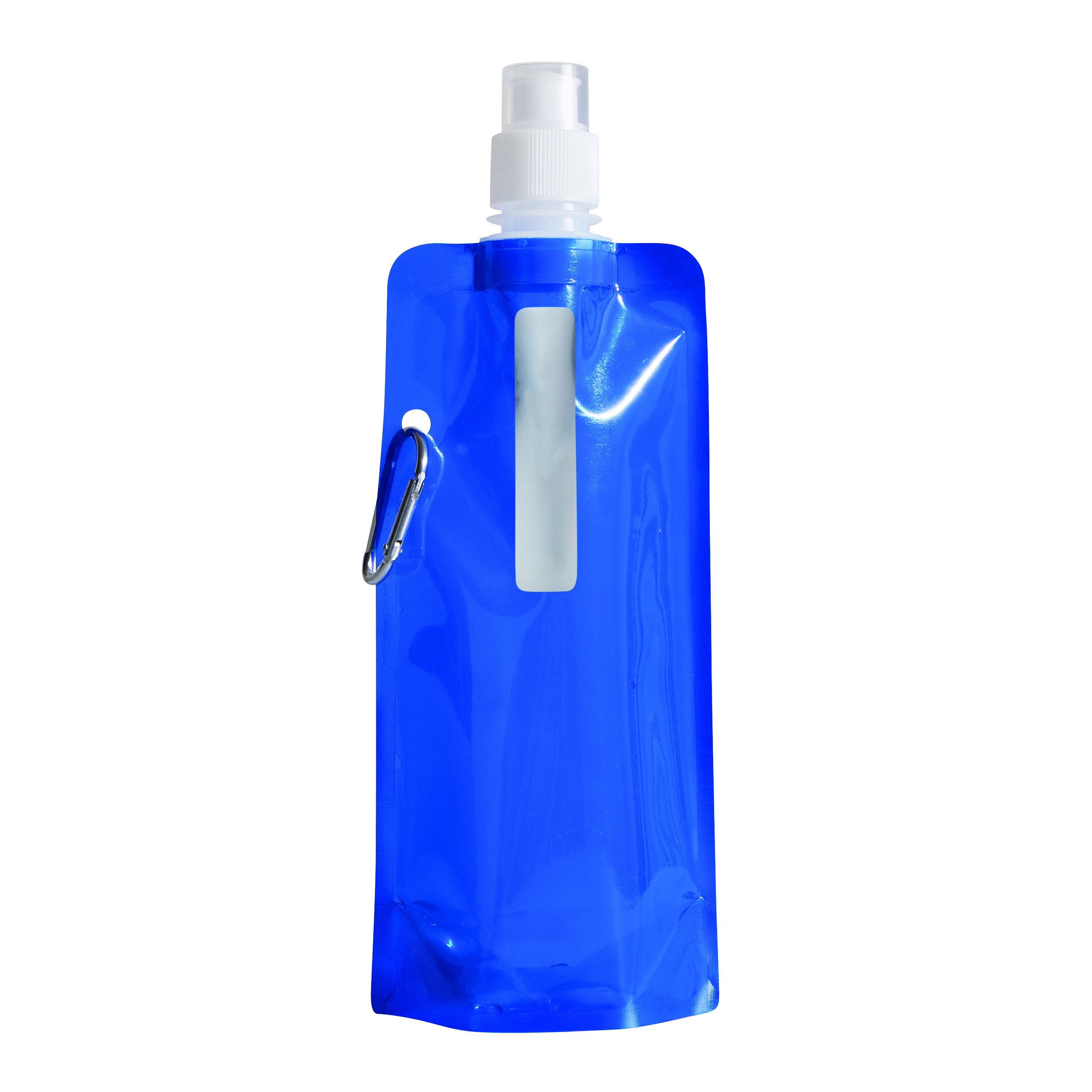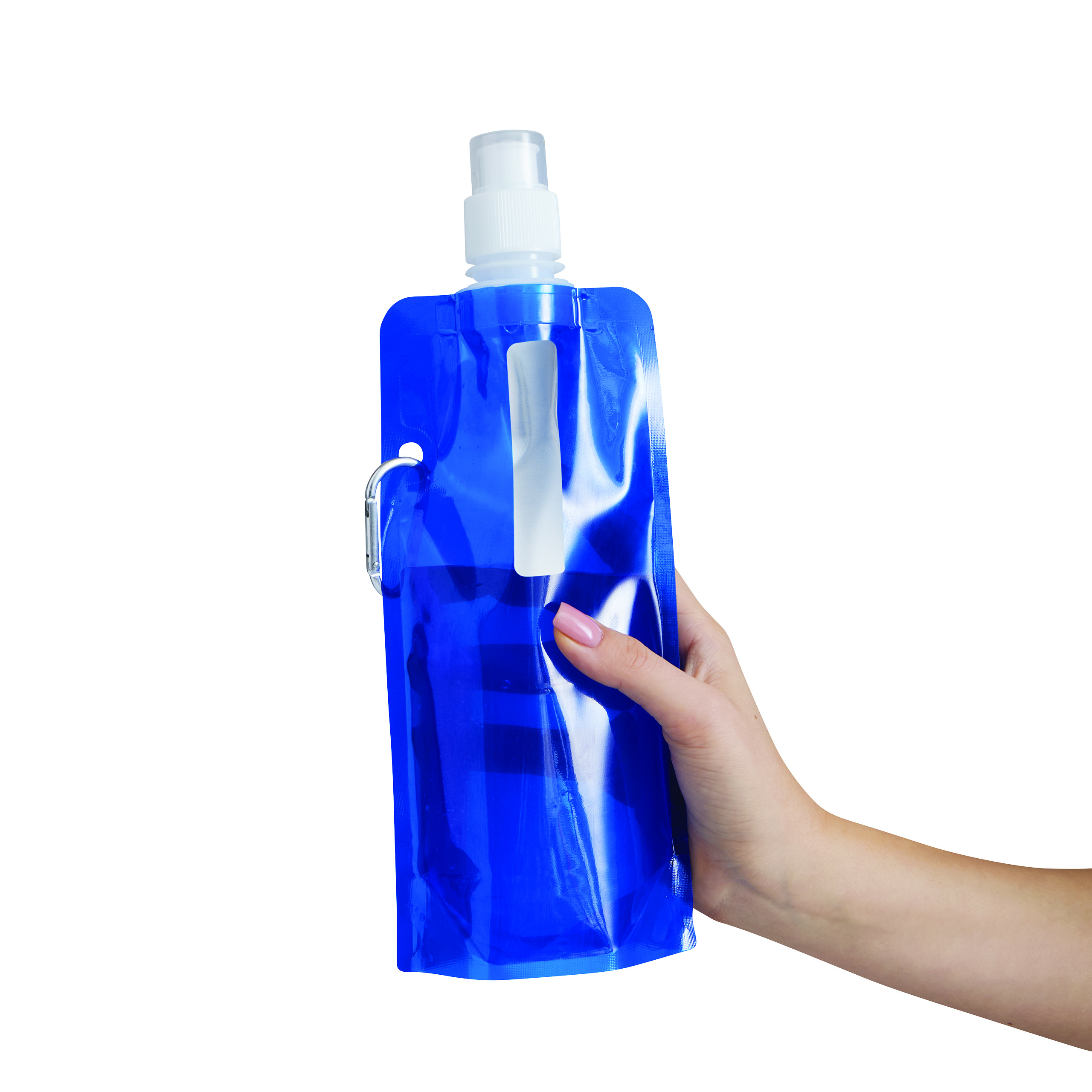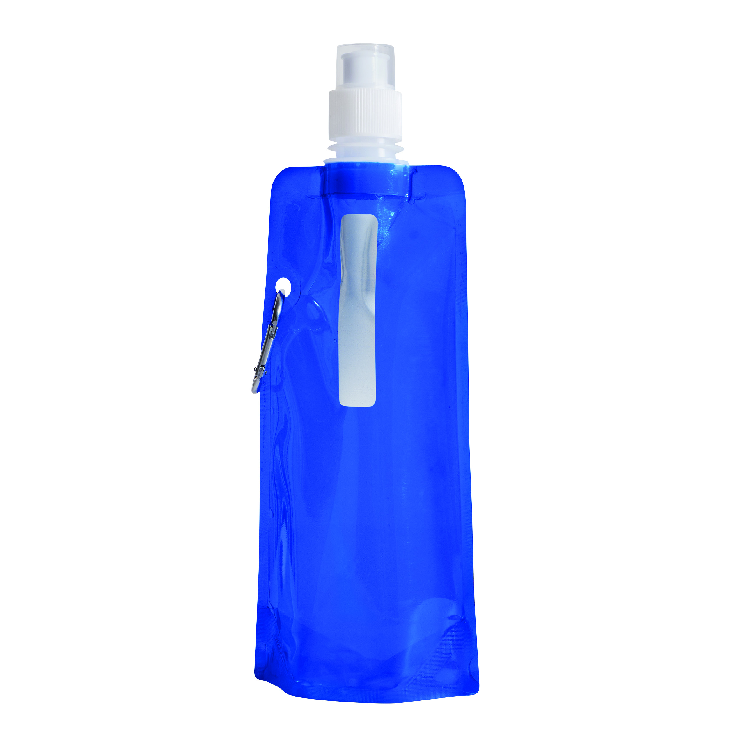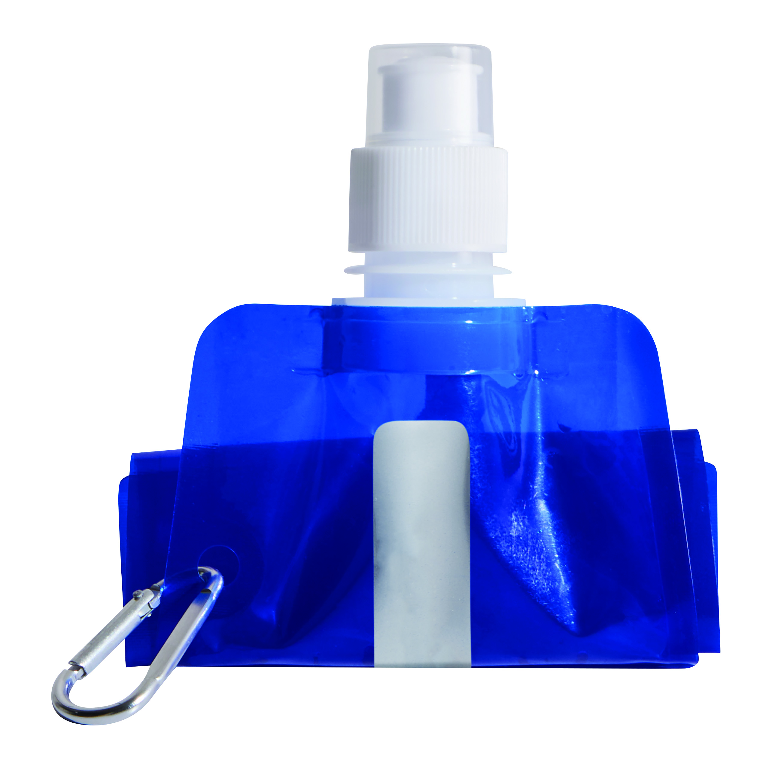 Trinkflasche AQUAFOLD: falt-, bzw. rollbar im ungefüllten Zustand, transparente Verschlusskappe, mit Karabinerhaken (der Karabiner ist NICHT als Sicherung beim Klettern geeignet), Füllmenge ca. 400 ml