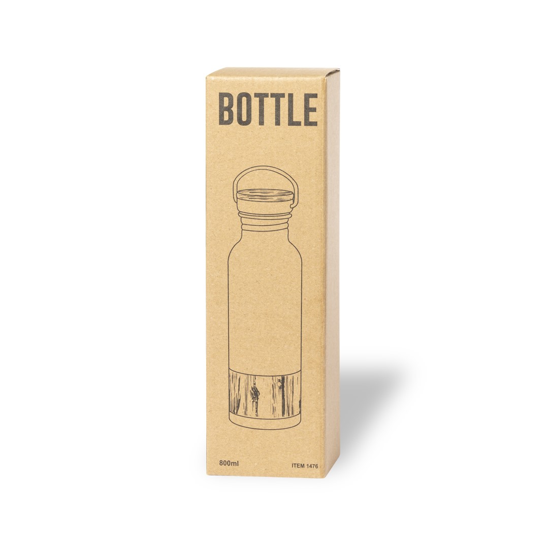 Flasche mit originellem Retro-Stil und 800 ml Fassungsvermögen. Gehäuse aus Edelstahl mit Bambusband, Schraubdeckel aus Edelstahl und Bambus-Detail. Präsentiert in einer individuellen Box von Öko-Design in Kraftkarton.